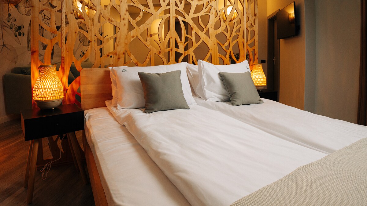 La habitación ofrece un espacio elegante y acogedor, perfecto para aquellos que quieren comodidad adicional y una experiencia relajante. El espacio impresiona por su diseño moderno, la atención a los detalles y las comodidades de primera calidad, que incluyen una cómoda cama doble (180x200 cm), baño privado totalmente equipado e instalaciones que garantizan una estancia sin preocupaciones. El ambiente cálido y el balcón generoso convierten cada momento en una experiencia de relajación, perfecta para parejas o huéspedes que aprecian la comodidad.