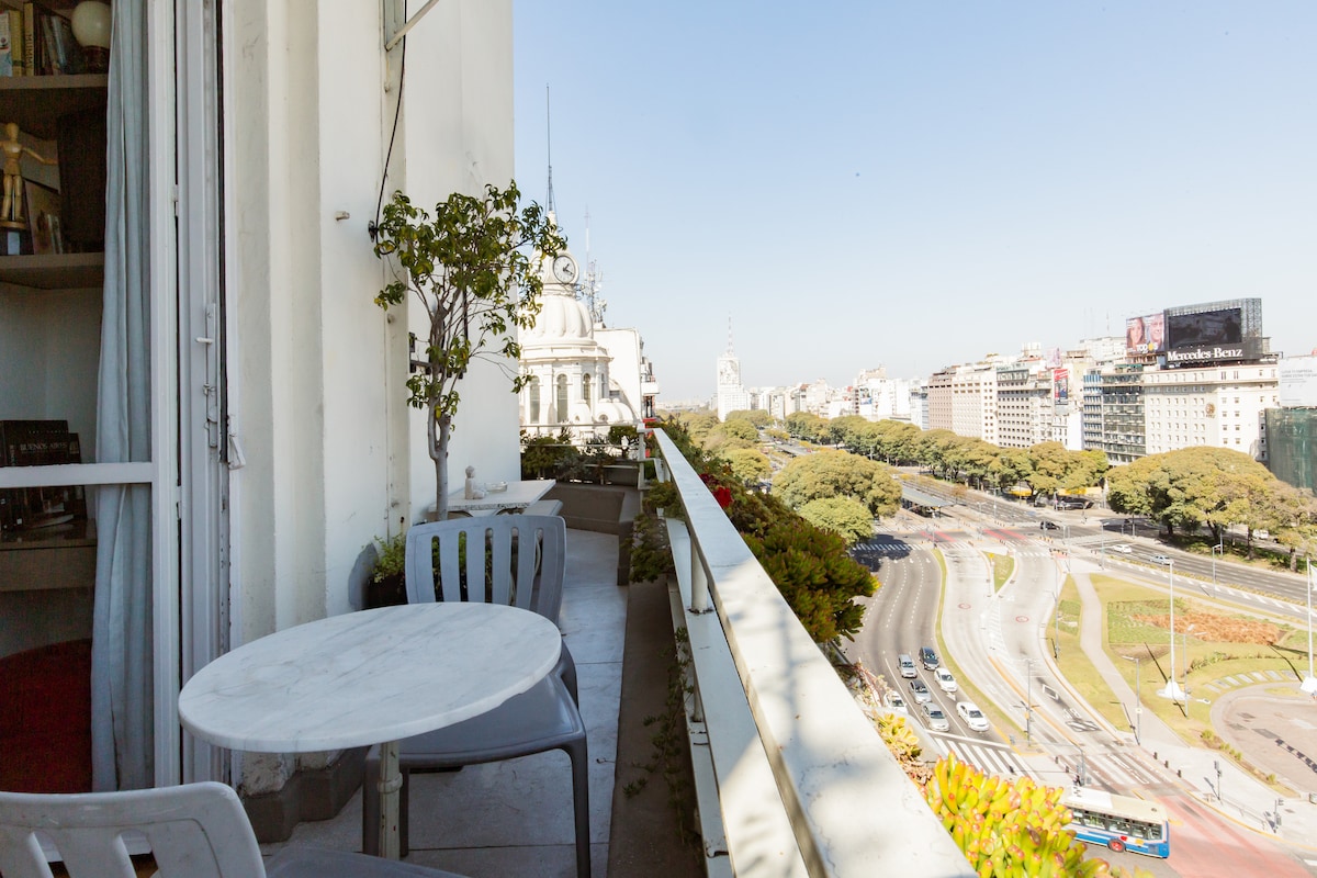 Ubicado en el corazón pulsante de la ciudad. Remodelado recientemente mezclando el estilo original del edificio de 1936 con las comodidades modernas. En el último piso de un edificio en esquina, con seguridad las 24 horas y 2 ascensores, con 2 dormitorios y balcón corrido con plantas, desde donde disfrutará de vistas de 270° del Obelisco, Av. 9 de Julio y Av. Corrientes. Aire acondiconado en ambos dormitorios y lavasecarropas, WIFI, cocina totalmente equipada, todo con estilo moderno y chic