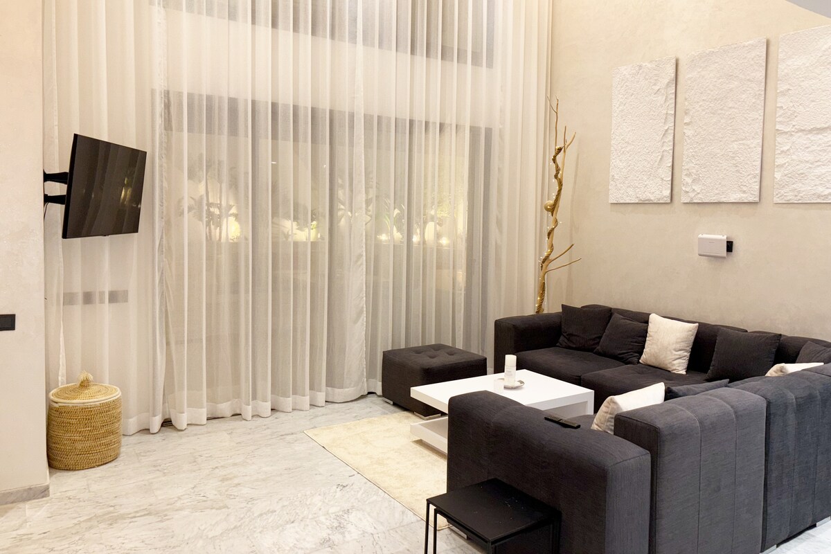 Descubre el lujo moderno en este elegante apartamento totalmente equipado en el corazón del distrito de Gueliz de Marrakech. Internet ultrarrápido lo hace ideal para viajeros de negocios y de placer. Camina hasta la estación de tren y el Teatro Real y disfruta de la proximidad a las tiendas Carré Eden. A poca distancia en taxi de Jamaa el Fna y de las principales atracciones. Por favor, ten en cuenta que no se aceptan parejas marroquíes solteras y huéspedes. ¡Reserva ahora para disfrutar de una experiencia inolvidable en Marrakech!