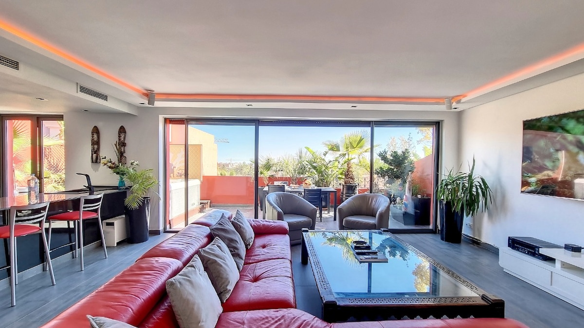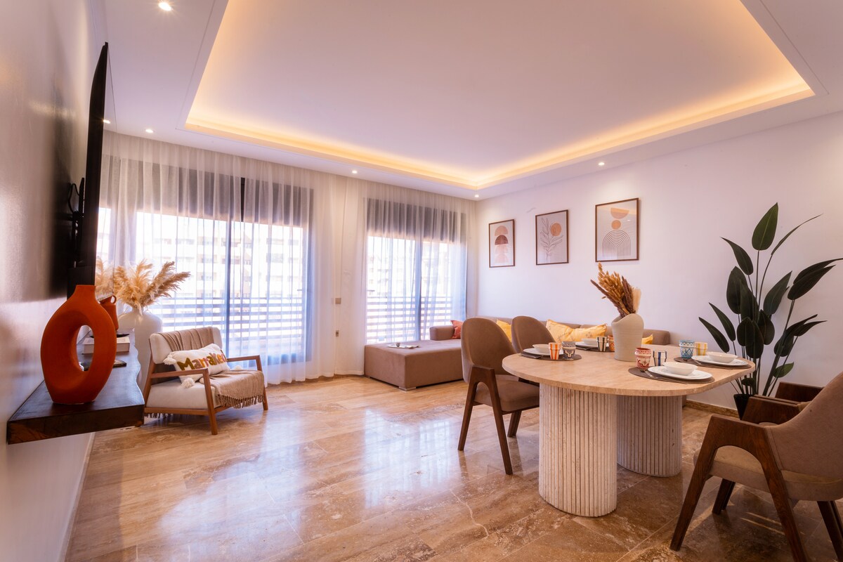 Disfruta del encanto de Marrakech en este elegante apartamento, situado en el centro de la vibrante zona de Hivernage. Una mezcla única de artesanía tradicional y confort moderno, con muebles hechos a mano procedentes de las montañas del Atlas. Diseñado por un artista. Con un ambiente acogedor. Ya sea que estés explorando las atracciones culturales cercanas o disfrutando de la vibrante escena local, este apartamento bien equipado sirve como la base perfecta. Disfruta de la comodidad de alojarte en el corazón de Marrakech.