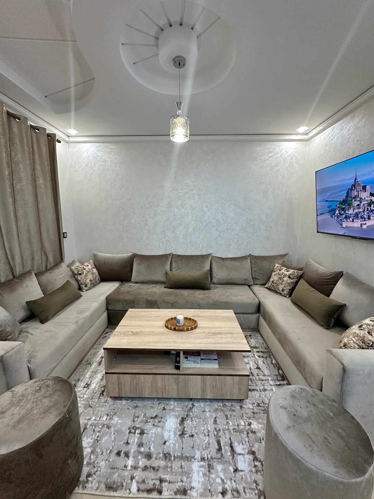 Moderno apartamento situado a 5 minutos en auto y a 25 minutos a pie de la UM6P, la OCP y la Ciudad Verde, en una zona tranquila y segura, muy cerca de supermercados, cafés, etc. El alojamiento está equipado con: wifi de fibra, lavadora, calentador de agua eléctrico, cocina completa, mesa de comedor, cafetera, etc. ⚠️ No se aceptan parejas no casadas.