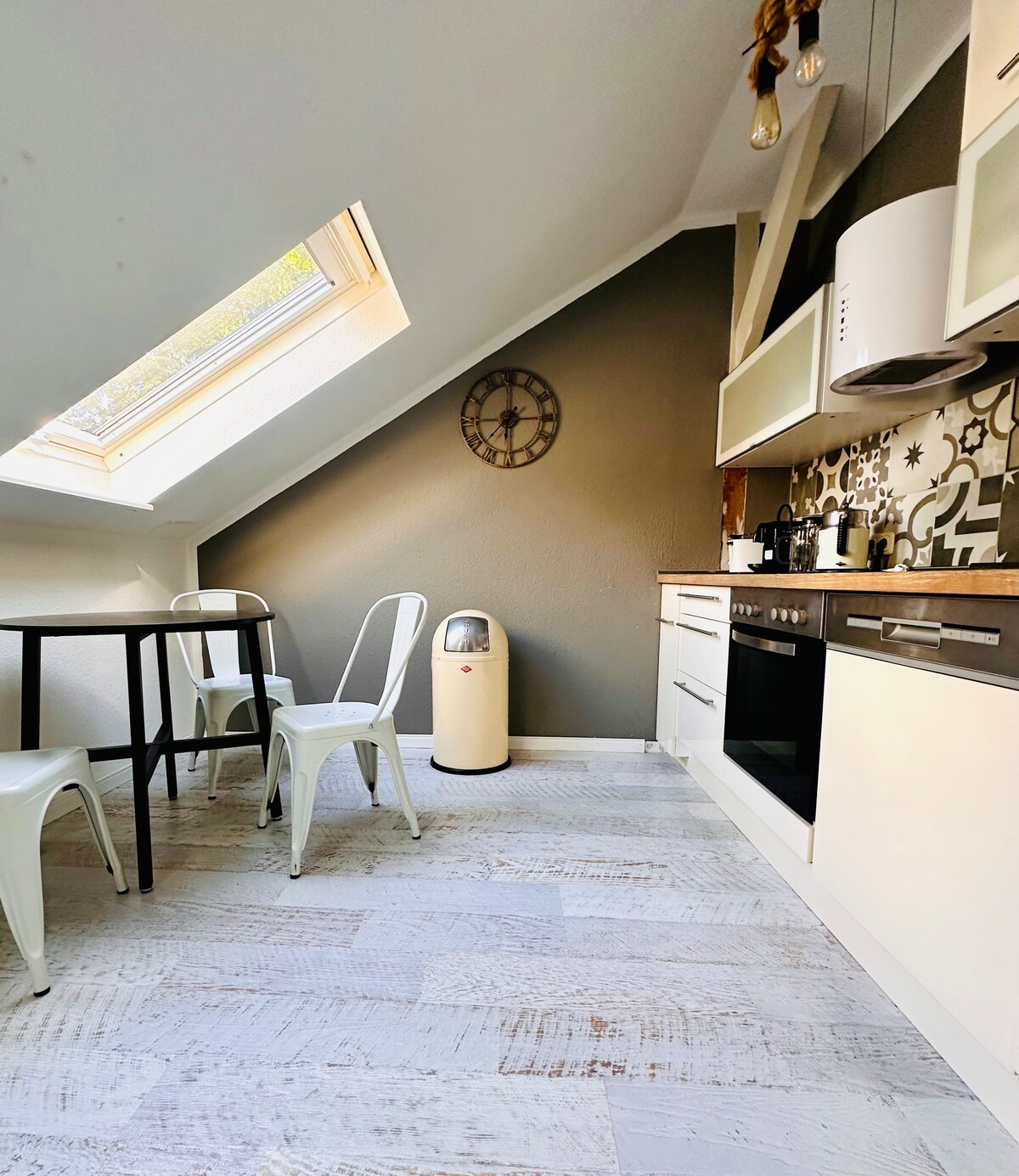 Acogedor y luminoso ático, 2 camas individuales de 1,00 x 2,00 m o juntas como cama doble (200 x 200), así como una cama individual (100 x 200) en una habitación contigua separada (también vestidor). Si se añaden más huéspedes, existe la posibilidad de desplegar un colchón plegable para el suelo; pequeña cocina americana totalmente equipada, gran bañera y ducha, televisión, teléfono y wifi Hay un aparcamiento privado justo delante de la puerta principal.
