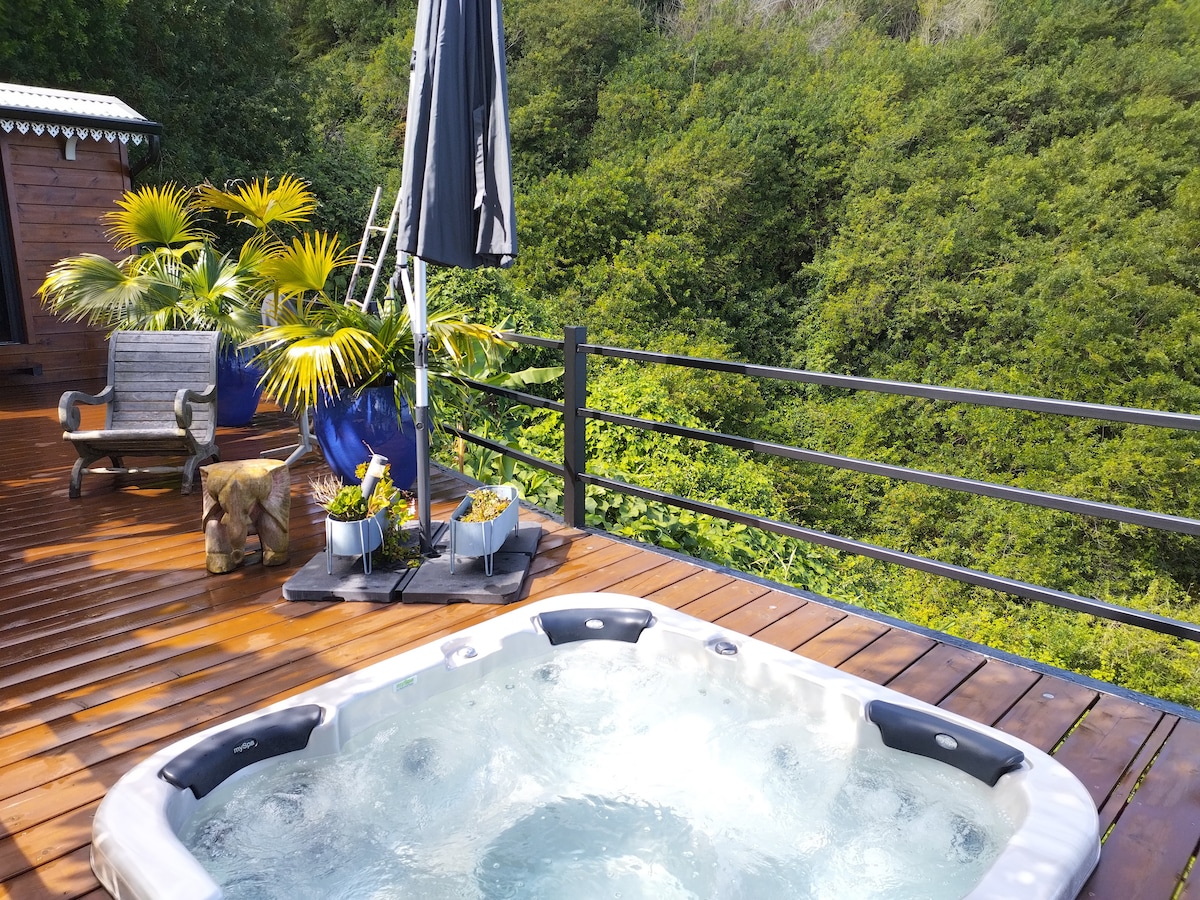 Avec son canapé-balançoire, dépaysement assuré dans cette chambre où la dominance du bois brut et la charpente apparente font penser à un chalet de montagne. Cette chambre insolite est habillée de meubles fait sur mesure en bois de récupération et notamment la balancelle face à la nature. La salle de bain offre aussi sa part d’originalité avec sa mosaïque au sol et sa baignoire balnéo avec vue sur l’extérieur. N'oublions pas sa grande terrasse privative avec vue sur la mer et le Piton Montvert.