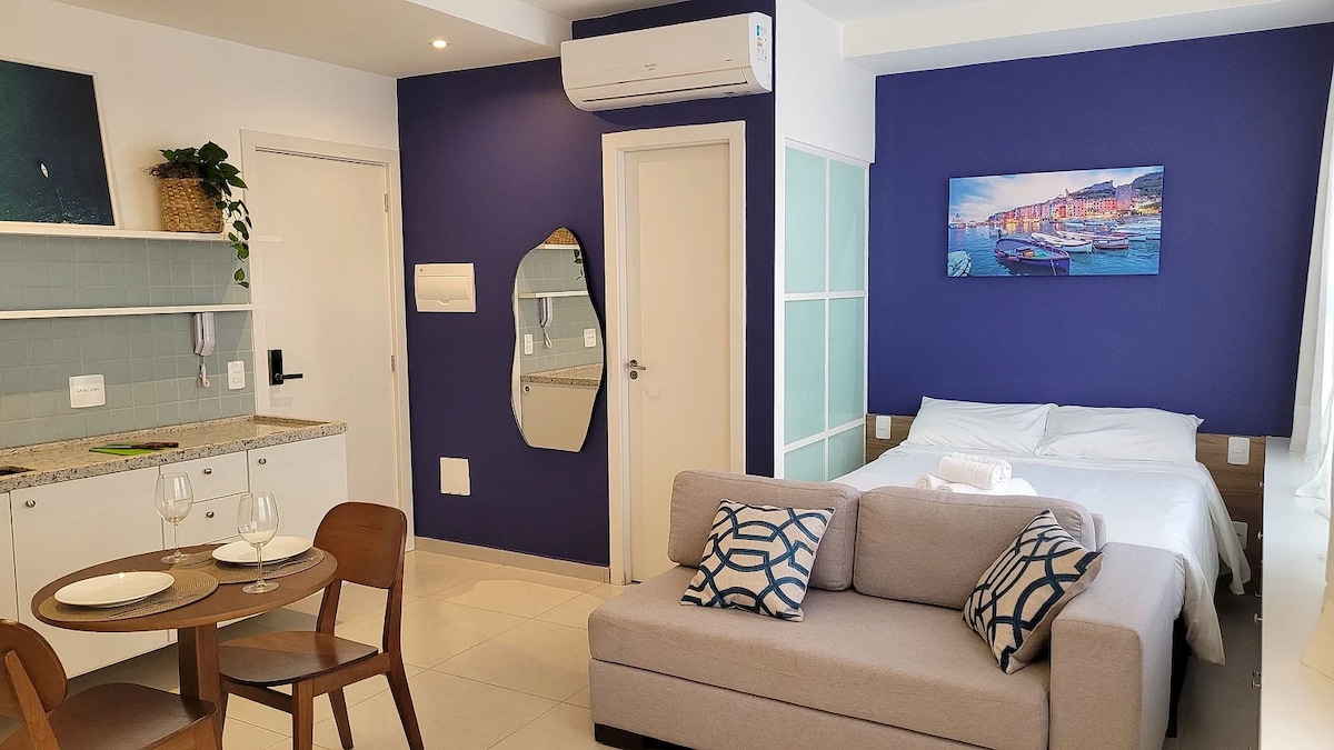 Apartamento Studio nuevo y moderno ubicado en una zona privilegiada de Ribeirão Preto, cuenta con Wi-Fi, aire acondicionado, cocina completa, smart Tv 40', gimnasio BlueFit en el edificio, Air fryer, plaza de garaje y área de ocio completa, piscina, sauna, sala de juegos, espacio gourmet, espacio de coworking para trabajar, home market 24h y la mejor ubicación de la ciudad, en la Avenida Presidente Vargas a 3 minutos del centro comercial Ribeirão y cerca de los mejores parques, bares y restaurantes de Ribeirão.