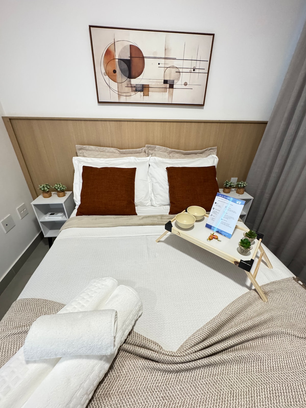 Divirta con tu familia en este lugar único y elegante. Estudio completo con wifi, TV inteligente, aire acondicionado, utensilios de cocina, cafetera eléctrica, filtro de agua, secador de pelo, plancha, 1 cama doble y un cómodo sofá cama y todo lo demás para tu comodidad. Tiene capacidad para 4 personas. Disfruta de áreas comunes como piscina, ascensor, estacionamiento, lavandería, conserje las 24 horas y gimnasio. Excelente ubicación, zona privilegiada de Ribeirão Preto, cerca de las tiendas de Ribeirão.