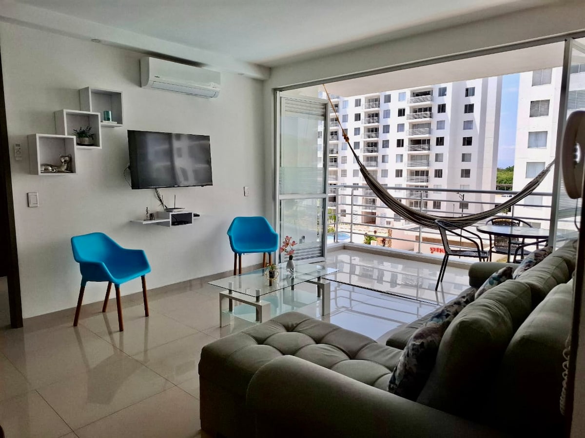Magnifico apartamento con espectacular vista, completamente dotado. Dos habitaciones cada una con aire acondicionado. Wifi, Smart TV en sala y habitaciónes con las aplicaciones de Streaming (Ingresar con sus propias cuentas debido a las políticas de las plataformas), BBQ gas natural en balcón, hamaca. Conjunto con jacuzzi, piscinas, tenis de mesa, billar pool, futbolín, gimnasio. Complejo deportivo con canchas de tenis, futbol 5, cancha múltiple, parque infantil e iglesias