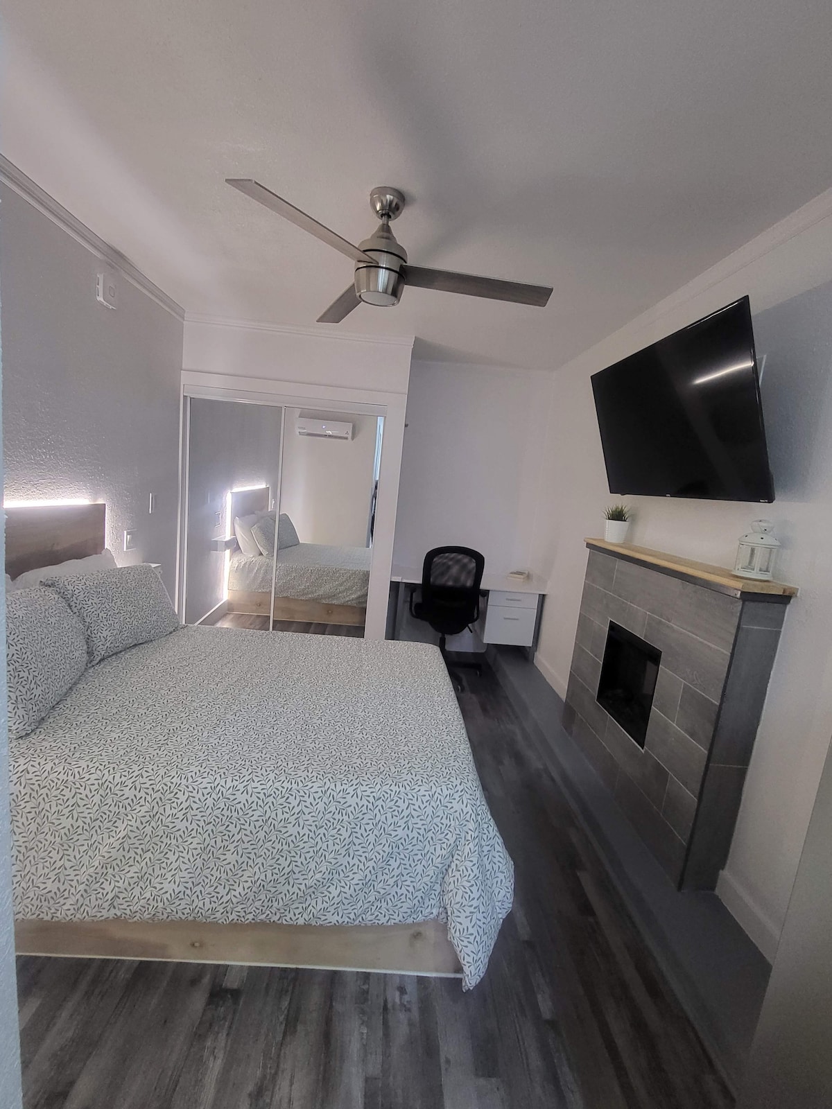 Relájate en este espacio tranquilo y elegante, Habitación privada con baño privado y cocina, entrada privada con cerradura inteligente. Se trata de un garaje reconvertido en habitación, es similar a una habitación de hotel donde se aprovecha al máximo el espacio, pensado para dos personas, es un lugar acogedor y práctico. Consta de un patio a la entrada donde te puedes relajar. Cuenta con cama matrimonial, espacio para trabajar, TV de 50 pulgadas, microondas, refrigerador y secadora de cabello.