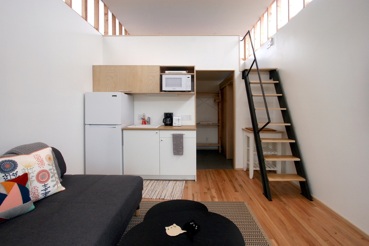 Suite privada de invitados con entrada privada y baño. Las ventanas Clerestory proporcionan abundante luz natural. Arreglos para dormir estilo loft con cama queen size. Espacio adicional para dormir en el sofá cama de tamaño completo. TV de 42"con antena y Roku Streaming. Cocina pequeña con nevera, café, microondas y hornalla de inducción. Baño de estilo europeo con ducha sin bordes y WC colgado en la pared. Calentador de agua sin tanque para agua caliente ilimitada.