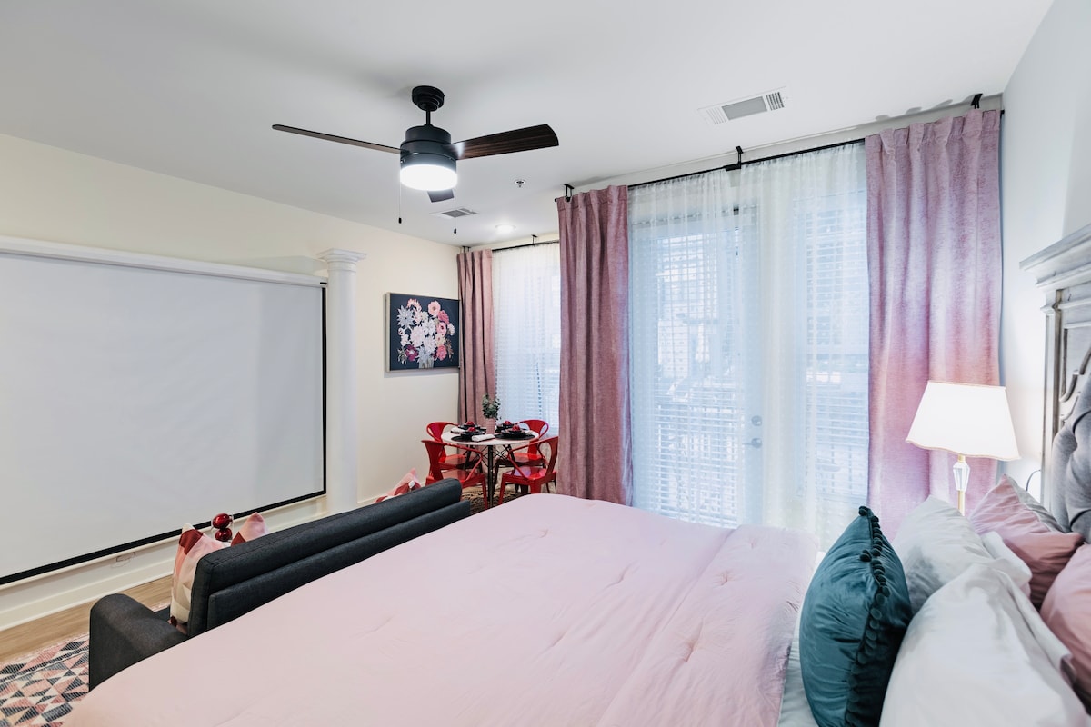 Este adorable estudio ha sido descrito como «simplemente romántico». Es un espacio bonito con características atrevidas como una cama tamaño king, pantalla de proyector de 135 pulgadas y estación de palomitas de cortesía para una noche de cine relajante. Cuenta con un pequeño balcón para disfrutar de la brisa, cocina, cafetera, lavadora y secadora. Está muy cerca de Shockoe Bottom, James River, paseo del canal, etc. También está a poca distancia a pie de restaurantes y tiendas cercanas. El edificio cuenta con gimnasio, patios al aire libre, piscina y salón. Aparcamiento gratuito en garaje para un coche.