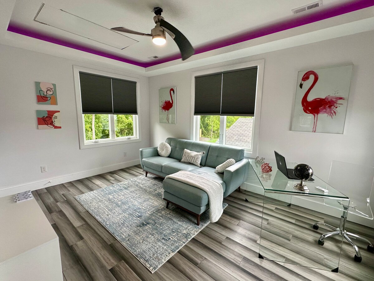 Este elegante y espacioso apartamento de un dormitorio y un baño se encuentra en el corazón de la ciudad, pero en una zona tranquila cerca del río. La habitación tiene una cama tamaño king con una decoración hermosa y subalquilada. Es divertido y está equipado con un televisor de 75 pulgadas para una noche de relajación en la acogedora sala de estar, una máquina de palomitas de maíz recién hechas, una Nintendo Switch y una cocina totalmente equipada. Está a poca distancia a pie de restaurantes y bares y a pocos minutos de VCU, James River, Carytown y la mayor parte de Richmond.