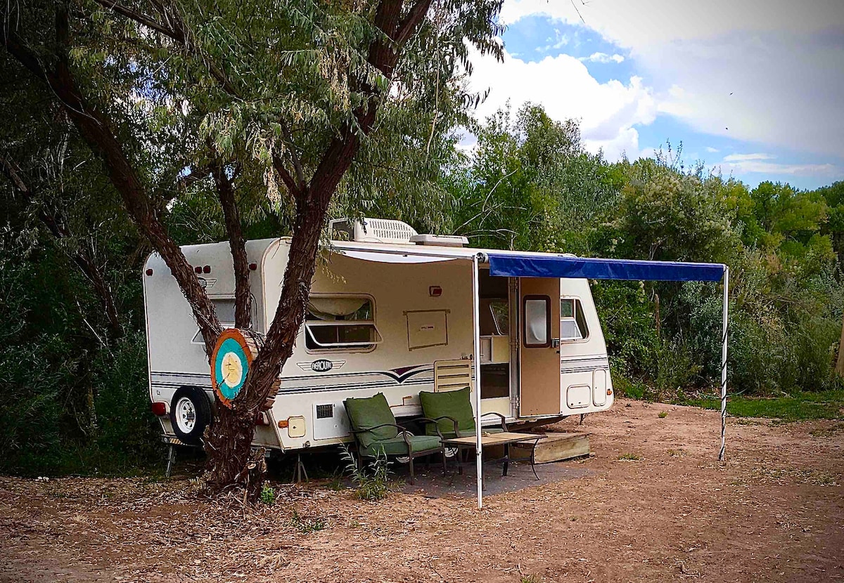 Esta pequeña y dulce caravana cuenta con todo lo necesario para una estancia acogedora. Una cama de matrimonio en la parte trasera y una vista al río en la parte delantera. Totalmente equipado con cocina, baño, comedor y patio, está a solo unos pasos del río Chama. Sumérgete en todo lo que el río tiene para ofrecer en el salón comunitario con una fogata y una parrilla a gas. ¡Una escapada de glamping perfecta!