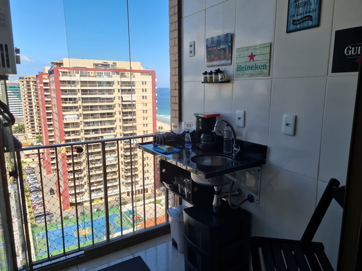 Hermosa suite , balcón gourmet, vistas a la playa de Barra da Tijuca, Pedra da Gávea y Canal da Barra. Pequeño balcón con encimera de lavavajillas, equipado para comidas rápidas y prácticas con microondas, freidora de aire, sándwichera, cafetera, tostadora , minibar, cubiertos, platos, vasos y pequeñas ollas de microondas. LA ATENCIÓN NO TIENE ESTUFA NI SARTENES. Habitación cómoda con mesa y 2 sillas, cama doble, armario y aire acondicionado. Baño con ducha de agua fría y caliente.