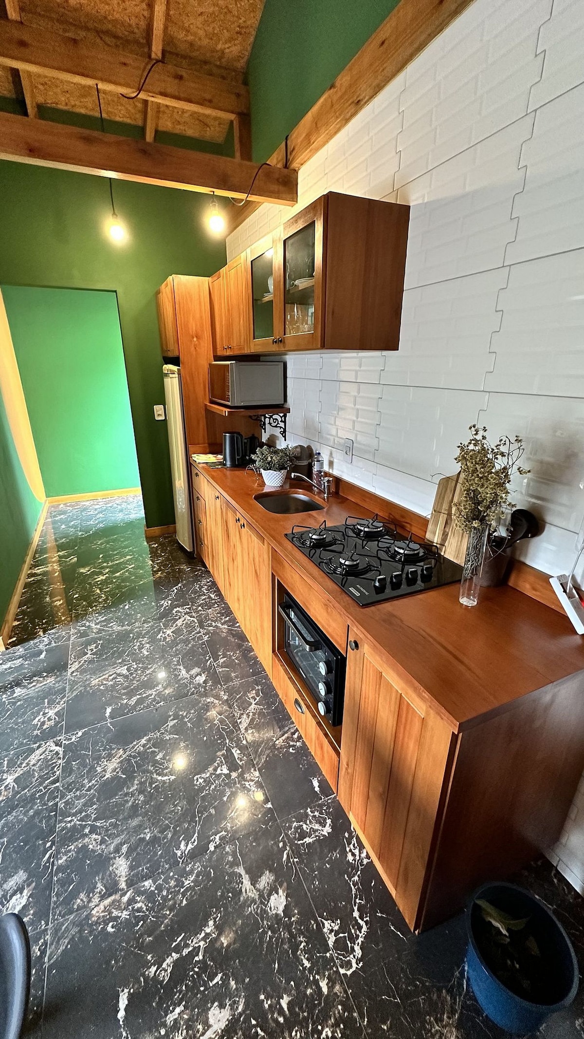 El chalet Una de @chalespanini tiene: Cocina totalmente equipada, microondas, horno eléctrico, licuadora. También ofrecemos artículos esenciales como sal, azúcar, café y detergente. La cama es súper cómoda con sábanas de cama y baño de calidad. La chimenea proporciona un ambiente agradable en los días fríos. Ofrecemos leña para la estadía. Jacuzzi para parejas con sales de baño. Ducha y grifos calentados con gas con una hermosa vista de la naturaleza.