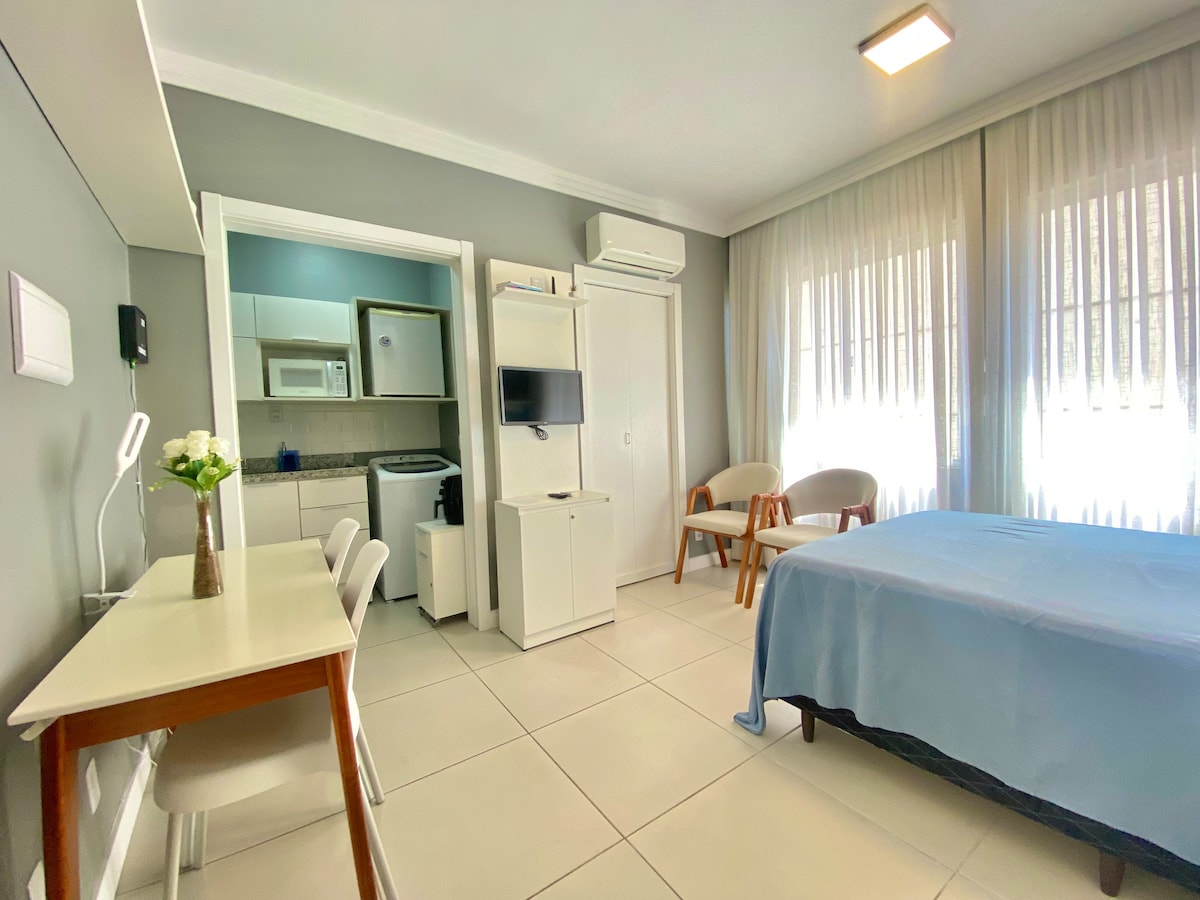 Viva uma experiência única neste estúdio acolhedor e elegante, projetado com atenção aos detalhes para oferecer conforto, funcionalidade e muito estilo. O ap azul planejado é um diferencial exclusivo, com iluminação suave e decoração pensada para relaxar, móvel inteligente e versátil que se transforma em mesa de jantar ou apoio para cozinhar — perfeito para quem valoriza funcionalidade. Piano digital disponível para relaxar, praticar ou se inspirar. Smart TV, Wi-Fi.