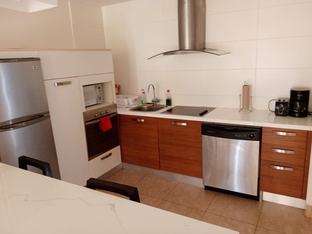 Amplio, luminoso y confortable apartamento de 120 mt2. Lobby privado de acceso, salacomedor, hab principal con baño interno, hab secundaria con balcón y baño, cocina full equipada (nevera, estufa con horno a gas, fregaplatos electrico, microondas, cafetera eléctrica, tostadora, licuadora, etc). Terraza con mesa para 6 personas y asador a gas. A/A split en todos los ambientes. Un estacionamiento.