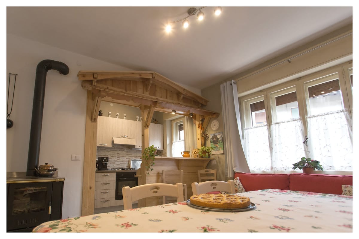Apartamento característico ubicado en el pueblo de Parech di Agordo, al pie de las montañas (muy cerca del inicio de los senderos) y a pocos pasos del centro. Consta de una sala de estar con cocina americana y chimenea, un dormitorio doble, un baño con ventana y una escalera para ser utilizada como trastero. La sala de estar tiene un sofá grande que se puede utilizar como dos camas individuales. Afuera, un pequeño rincón verde. No se admiten mascotas y está prohibido fumar. Estacionamiento cercano.