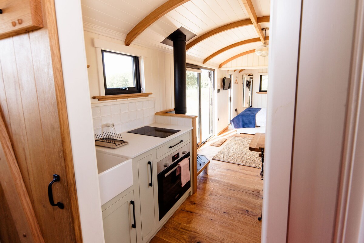 Ruby Retreat es un exclusivo carromato construido a mano en alerce, cedro y fresno por el carpintero local, Peter Milner. Su diseño y artesanía expertos le dan a Ruby una sensación muy especial. Es nueva para 2023. Se encuentra en su propia posición aislada en una granja de Devon en funcionamiento. Las vistas sobre las gloriosas colinas de Devon son realmente cautivadoras. No hay nada que te distraiga de contemplar los campos, colinas, bosques y la aguja de la iglesia distante (bueno, tal vez algunas ovejas y corderos retozando).