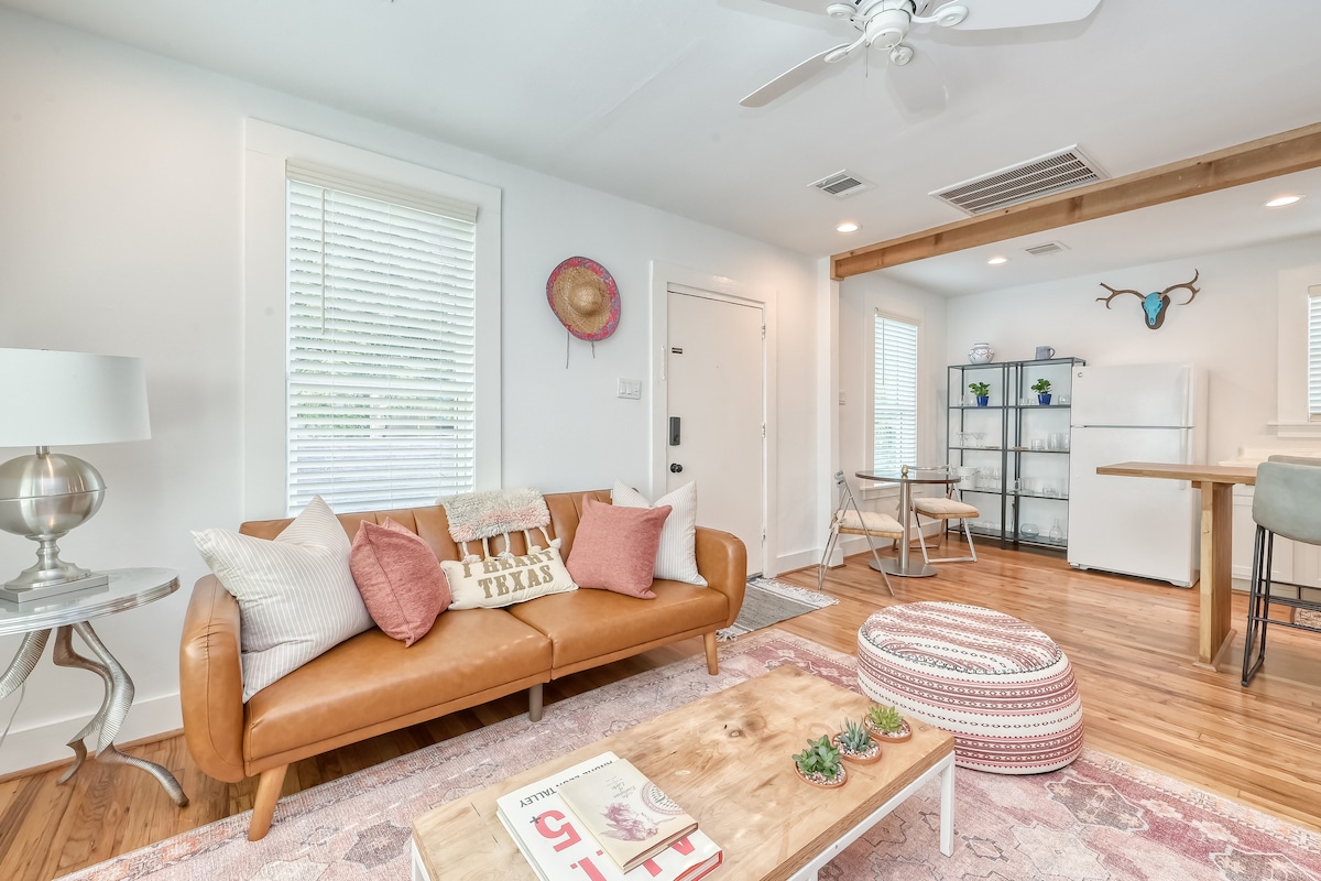 ¡Te damos la bienvenida a tu retiro en Montrose! Este loft de 2 dormitorios/1B cuenta con cómodas camas tamaño king, estacionamiento gratuito y wifi rápida. Relájate en la acogedora sala de estar con dos sofás, TV y zona de trabajo. Disfruta del patio privado o cocina en la cocina completa con una estufa de gas. Situado en el corazón de Houston, estás a pocos minutos de los mejores restaurantes, bares, museos y estadios. Ya sea que estés aquí para explorar o relajarte, ¡te encantará el espacio luminoso y acogedor!