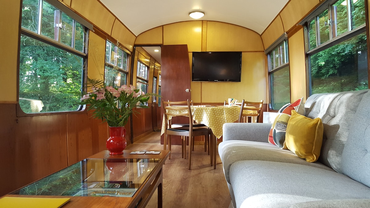 El carruaje de primera clase de un tranvía vintage bellamente restaurado con vistas espectaculares. Este tranvía histórico es un alojamiento único a medida, tiene muchas características originales, tallas/trabajos de frisos y luces de cuarto. Y acogedora estufa de leña, cama doble, cocina, vitrocerámica eléctrica, nevera, microondas, barbacoa, iluminación LED, terraza y asientos, espectaculares vistas al valle, acunado por montañas distantes y jardín privado. Inodoro y ducha caliente separados. Construido por Wallasey Tram Co. Alrededor de 1900. Cerca de Hafran Forrest y lagos.