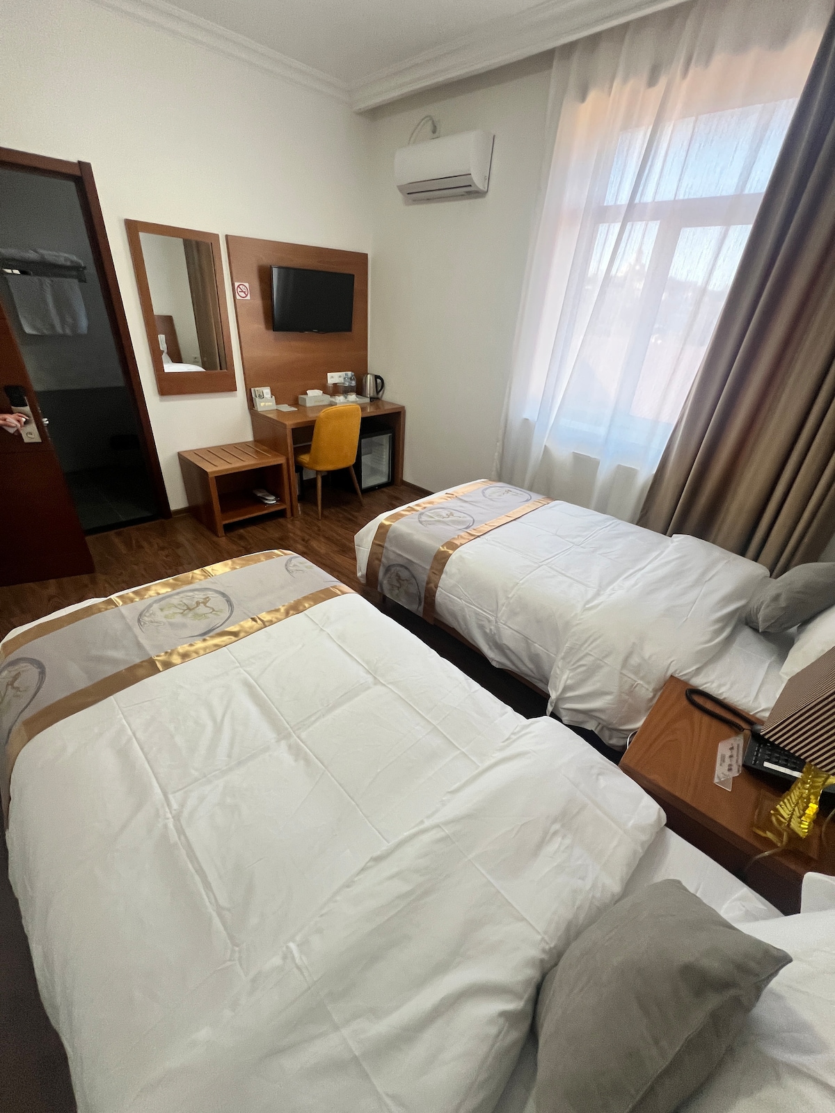 Bright room with two queen beds, ideal for small families or groups of four. Includes a private bathroom with a walk-in shower, free Wi-Fi, TV, safe, mini fridge, and an electric kettle with coffee and tea. Fresh towels, bed sheets, and toiletries provided. Shared kitchenette and co-working space available. This room faces the rear side of the building. Located in central Vake. Contactless check-in/out