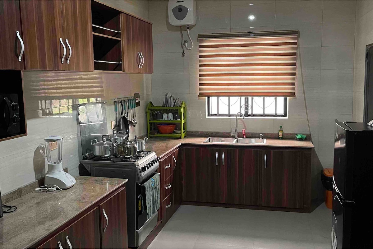 El departamento Goshen Arena, situado en New Owerri, cerca del Hotel Protea, ofrece un alojamiento elegante e ideal para familias, con 4 dormitorios con baño, 2 encantadoras salas de estar, televisores inteligentes con Netflix, wifi gratuito (Starlink, de confianza), aire acondicionado, cocina moderna, seguridad 24 horas del día, los 7 días de la semana, y estacionamiento exterior. Servicios de videovigilancia, suministro eléctrico 24/7 (inversor de 20 KVA y generador de reserva), agua 24/7, estacionamiento en las instalaciones y alquiler de autos opcional, servicios de cocina y capellanía. Un apartamento sereno, para no fumadores y sin fiestas, ideal para familias, grupos y viajeros que buscan comodidad y conveniencia.