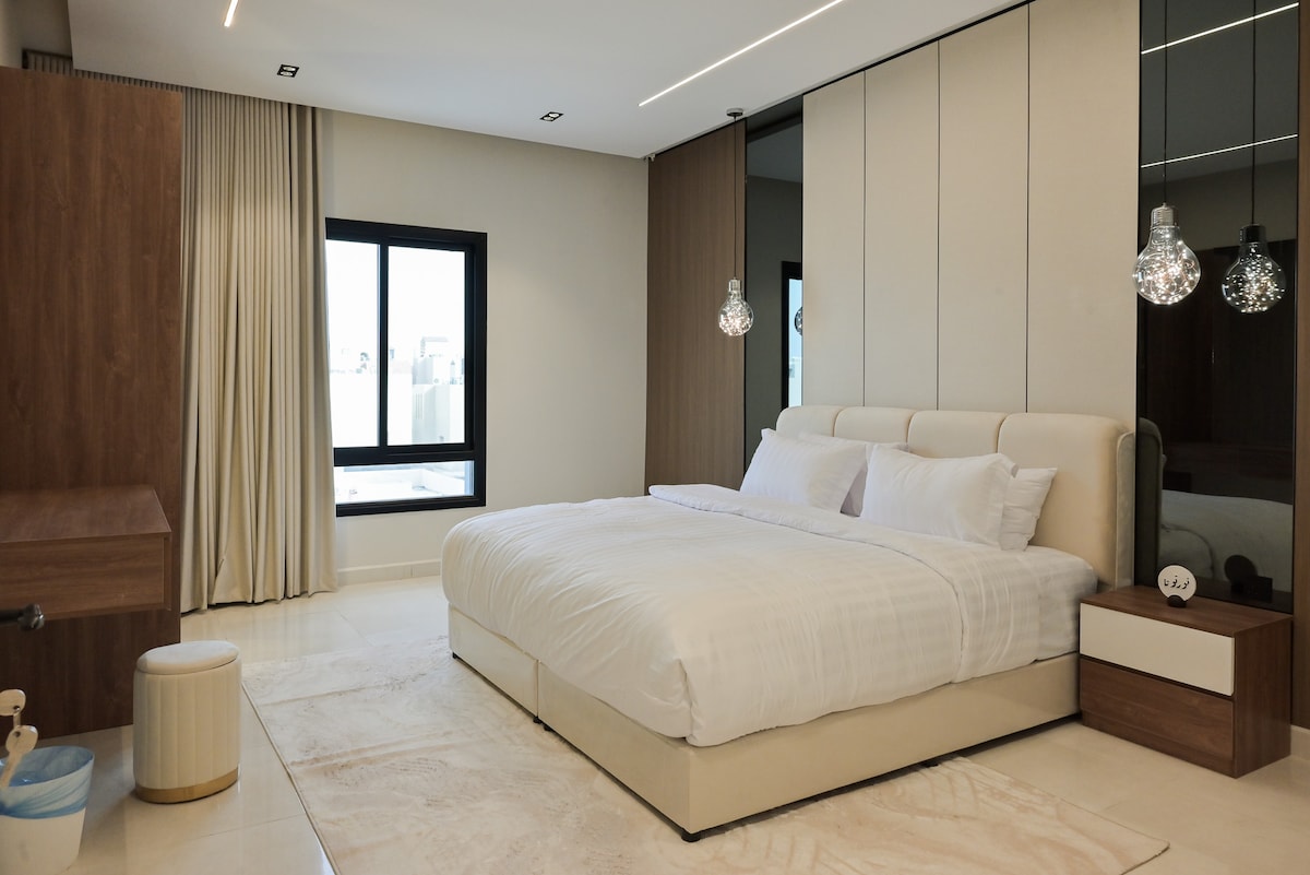Apartamento de lujo en el barrio de Hattin, junto al bulevar de la temporada de Riad, en el edificio Homtel Residence Con entrada automática inteligente que consta de: - Piscina privada con vistas al KAFD y al Boulevard - Billar - Zona de estar exterior - Sala de estar con televisor inteligente, comedor, cocina y baño para invitados - Cocina completa (horno / nevera / microondas / cafetera / hervidor / lavadora automática / utensilios de cocina) - Habitación principal con baño independiente - Dos dormitorios con dos camas individuales y un baño compartido - Nota: El Boulevard de Riad está a solo 5 minutos a pie.