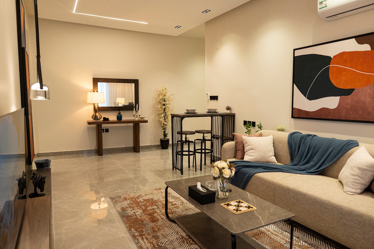 Un departamento elegante y cómodo con un diseño moderno que combina confort y elegancia. Incluye muebles contemporáneos y tonos cálidos que crean un ambiente relajante, con una iluminación cuidada para mejorar el ambiente. El apartamento está equipado con TV inteligente para entretenimiento, toques artísticos y decoración moderna que agregan un toque de encanto. Totalmente equipado tanto para estancias cortas como prolongadas, está idealmente ubicado cerca de atracciones clave y servicios esenciales en Riad.