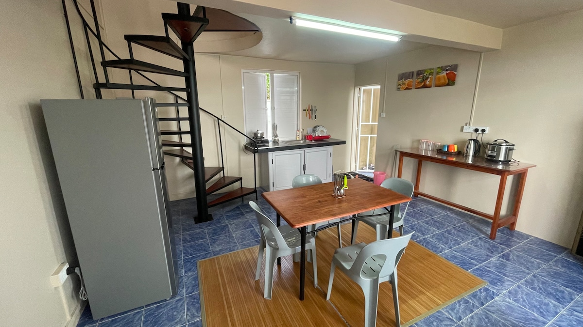 Nous sommes à 50 mètres de la plus belle plage de Rodrigues, la plage de Saint Francois, et a 30 minute de Trou D'argent a pied. Le Studio est a 300 metres du Terminus de bus, et dispose d'un parking pour votre voiture. Sobre, propre, le studio comporte 1 lit double, une salle de bain avec douche, un petit coin cuisine exterieur et interieur (Frigo, Four, Micro-onde, Bouilloire, etc...) et une terrasse vue sur mer. La chambre est aussi équipée d'un ventilateur.