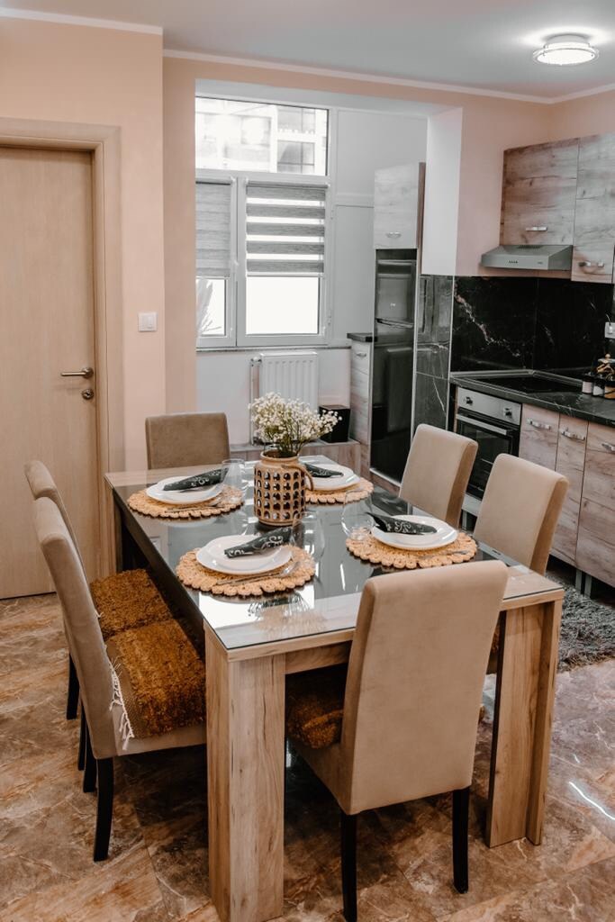 Apartamento de lujo en el centro de la ciudad. El apartamento de 60 m2 tiene una sala de estar, un dormitorio con cama doble, calefacción por suelo radiante, cocina con todos los elementos necesarios, terraza. Hay aparcamiento gratuito a 50 m. El apartamento está situado junto al restaurante de lujo - jardín ALEKSANDAR.