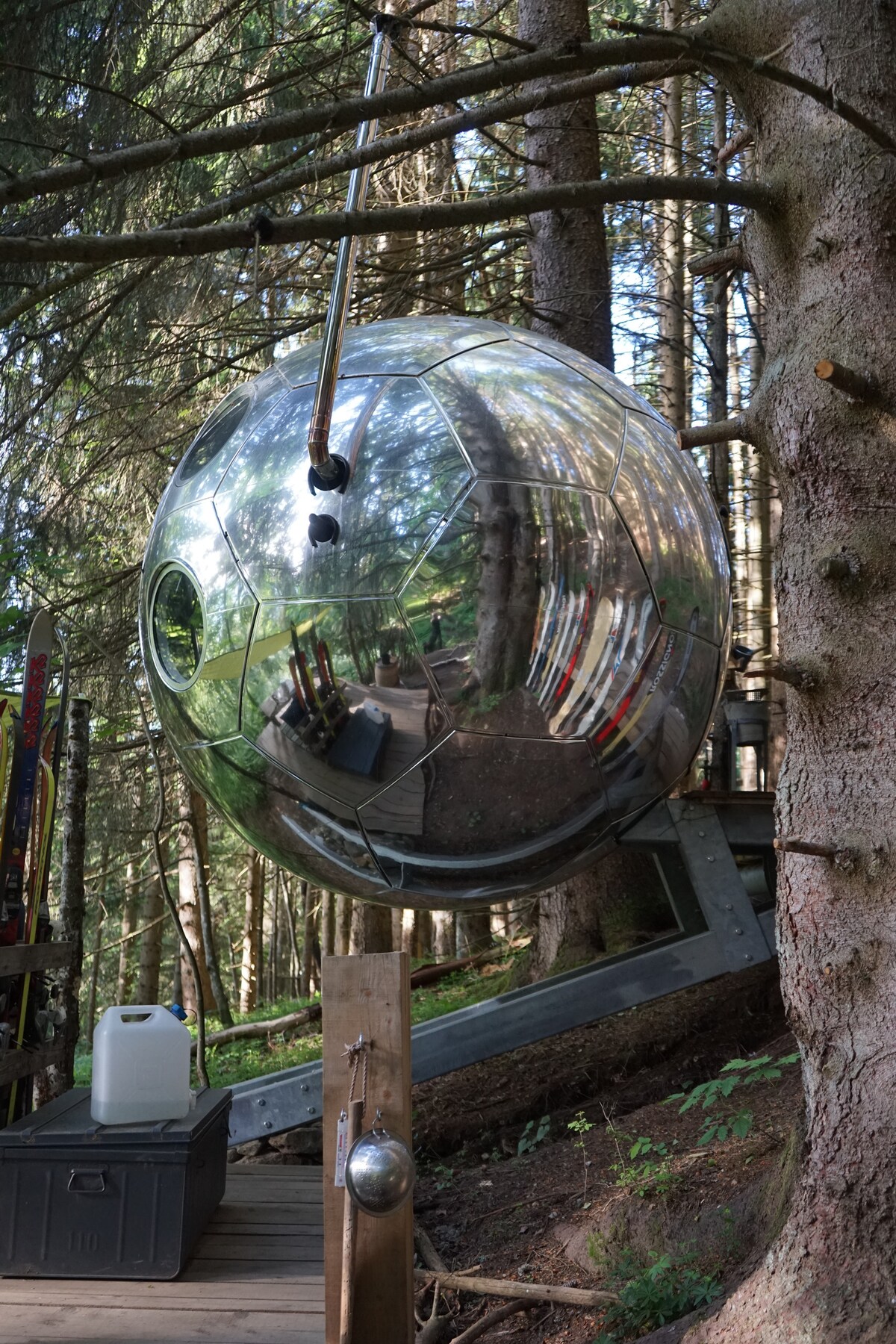 Cocoon con esfera de espejos: montaña y jacuzzi