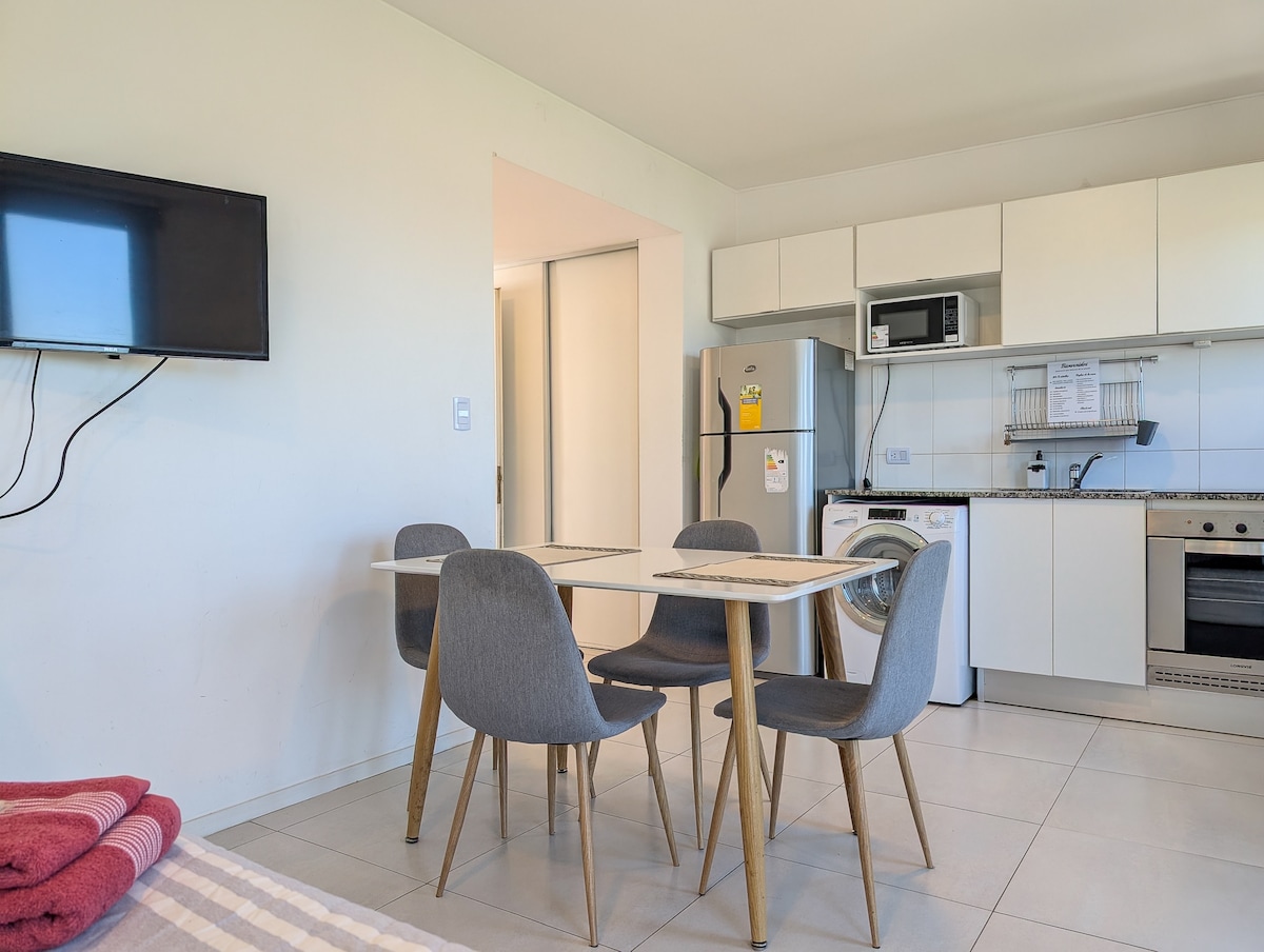 Amplio monoambiente con COCHERA en Puerto Norte, totalmente equipado para una cálida y provechosa estadía en la ciudad. Ideal para disfrutar la ciudad de vacaciones como para ejecutivos que vengan a la ciudad en busca de cumplir metas laborales o de estudio. Incluye sábanas y toallas. No incluye jabón y shampo. No tiene pileta.