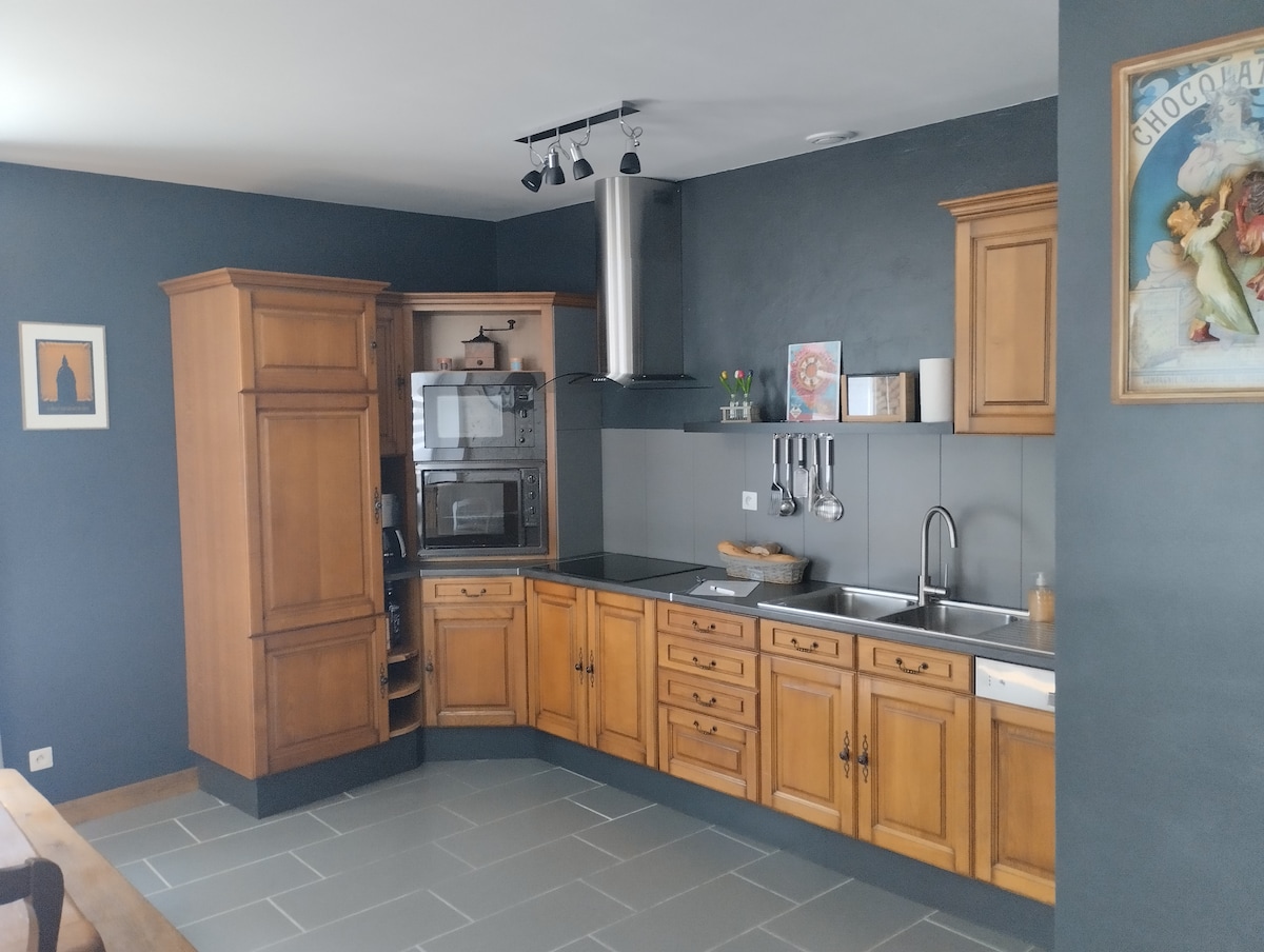 Pequeña casa adosada con nuestra casa, equipada para alojar a 4 adultos (o hasta 5 personas para personas que viajan con niños) con una habitación de los padres y una habitación infantil con 1 cama individual y 1 sofá cama. No se proporcionan sábanas ni toallas. Frigorífico grande, microondas, lavadora, lavavajillas. Situado a 3 km del pueblo. Lamentablemente, no podemos aceptar sus mascotas. Muy tranquilo, gran jardín arbolado, entorno agradable.