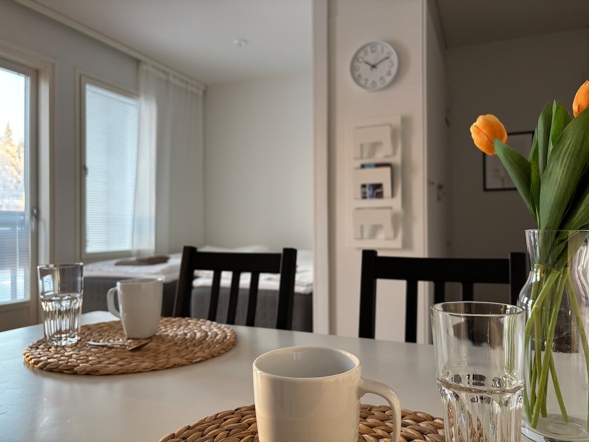 Acogedora habitación con baño, cocina pequeña y balcón francés cerca del centro de la ciudad. Cama de 140 cm de ancho. Sábanas, toallas y utensilios de cocina. TV. Microondas, lavadora. En un sótano hay una sala de secado. Supermercado, estación de autobuses y estación de tren a pocos pasos. Hay un estacionamiento gratuito a lo largo de Karhunkaatajantie. También puedes estacionar en el patio durante 3 horas con un disco de estacionamiento. Te enviaré instrucciones para la llegada autónoma una vez que hayas reservado. ¡Disfruta de Laponia!