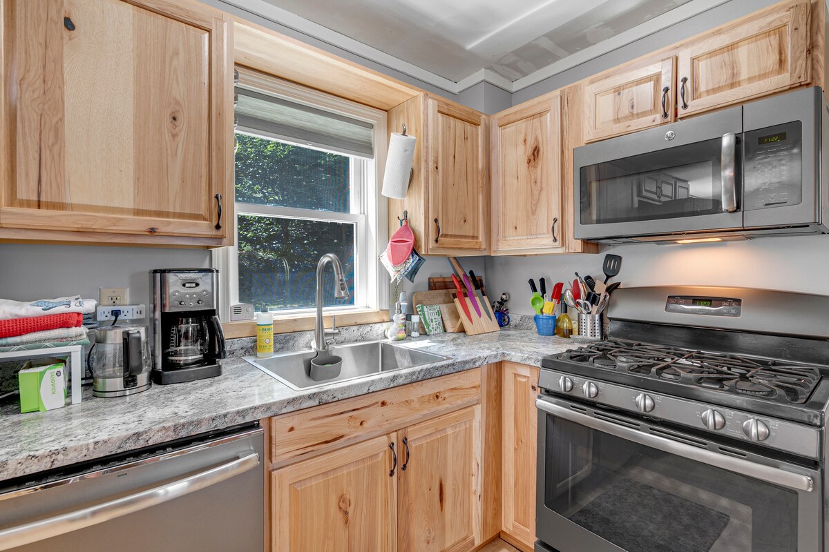 Tienes acceso completo a esta espaciosa casa. Disfruta de la gran cocina con una isla de preparación de alimentos, amplio espacio en el mostrador, utensilios básicos de cocina e ingredientes para cocinar y hornear. La mesa del comedor tiene capacidad para ocho personas. Relájate en la sala de estar con un monitor de TV para transmitir tus servicios preferidos, muebles cómodos y una estufa de pellets. Un dormitorio está en la planta baja y dos arriba. La sala de estar está a 4 pasos de otras zonas de la planta baja. No hay monitores de TV en los dormitorios.