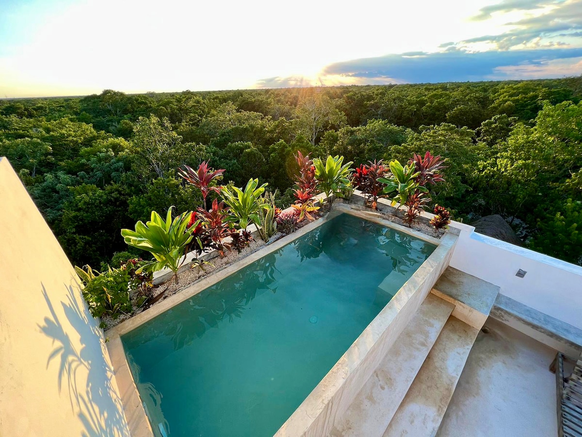 Nuestro elegante alojamiento es perfecto para viajes en grupo y vacaciones familiares inolvidables. Te invitamos a nuestro ático de lujo en la selva de dos dormitorios con piscina privada en la azotea en el corazón de Maya Jungle. Date la oportunidad de experimentar la tranquilidad y la belleza de la naturaleza mientras estás a pocos minutos de las atracciones locales, las playas, el centro de Tulum y los cenotes, y tienes todo para una estadía cómoda y aún más. ¡Hacemos todo lo que podemos para asegurarnos de que nuestros huéspedes tengan vacaciones que realmente se merecen !