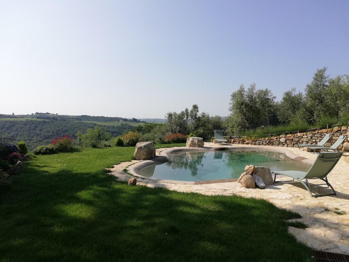 Encantador apartamento en un pueblo rural a menos de 20 km de Siena, a 15 de San Gimignano y a 45 de Florencia. Se encuentra en una casa del siglo XVIII en el pequeño pueblo de Lecchi, en la cima de una colina en el corazón del valle de Elsa, rodeado de viñedos, olivos y bosques de robles. El apartamento tiene 150 metros cuadrados de ancho, con una terraza privada de 50 metros cuadrados que se puede utilizar para comer fuera, disfrutando de uno de los paisajes más bonitos de la Toscana. Tiene capacidad para un máximo de 6 personas de una manera cómoda.