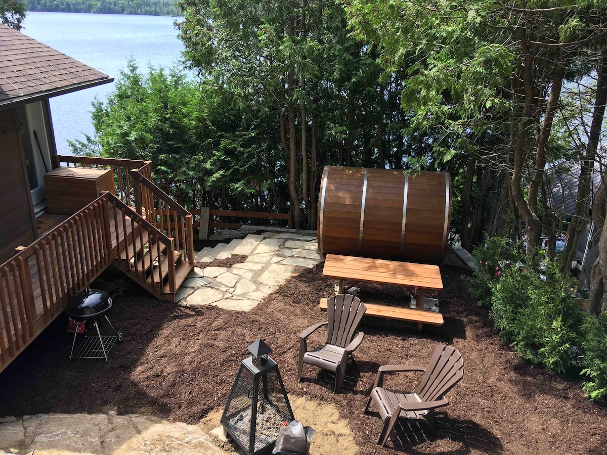 Acogedora pequeña cabaña rústica a orillas del lago Sarrazin(a menos de 25 pies). Cocina completa, TV por cable, Internet Wi-Fi, chimenea de leña, bañera de hidromasaje doble, barbacoa, hidropedales y kayaks. Lugar tranquilo Todo lo que necesita para desconectar de su vida diaria y rutinaria. A solo 10 minutos de todos los servicios necesarios y a 30 minutos de Mont-Tremblant. Ruta de senderismo, ruta de motos de nieve, carril bici, raquetas de nieve, esquí de fondo y varias montañas de esquí cerca.