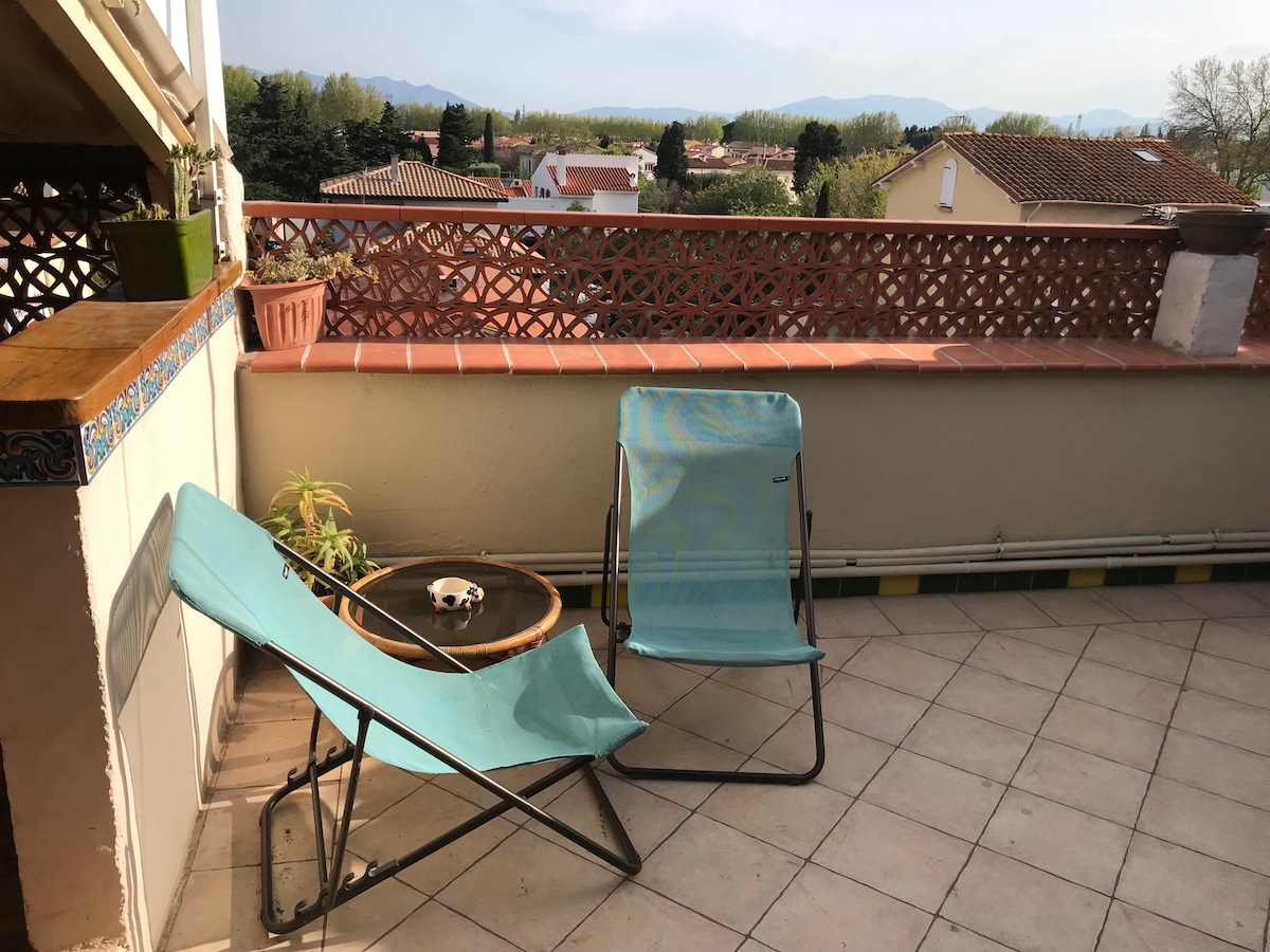 Disfrute de este alojamiento apacible y céntrico. En el primer y último piso, T2 de 65 m2 totalmente nuevo y equipado, muy tranquilo Conveniente: estacionamiento privado. El alojamiento: - Cocina totalmente equipada - Sala de estar sofá de 3 plazas y TV (wifi) - 1 dormitorio con una cama (140x190), gran armario Se proporcionan sábanas y toallas - 1 SDB con ducha italiana - 1 bodega con lavadora - Terraza 11 m2 Comercios de proximidad Situado a 10 minutos de Perpiñán, 7 minutos del aeropuerto, 25 minutos de las playas, 40 minutos de España