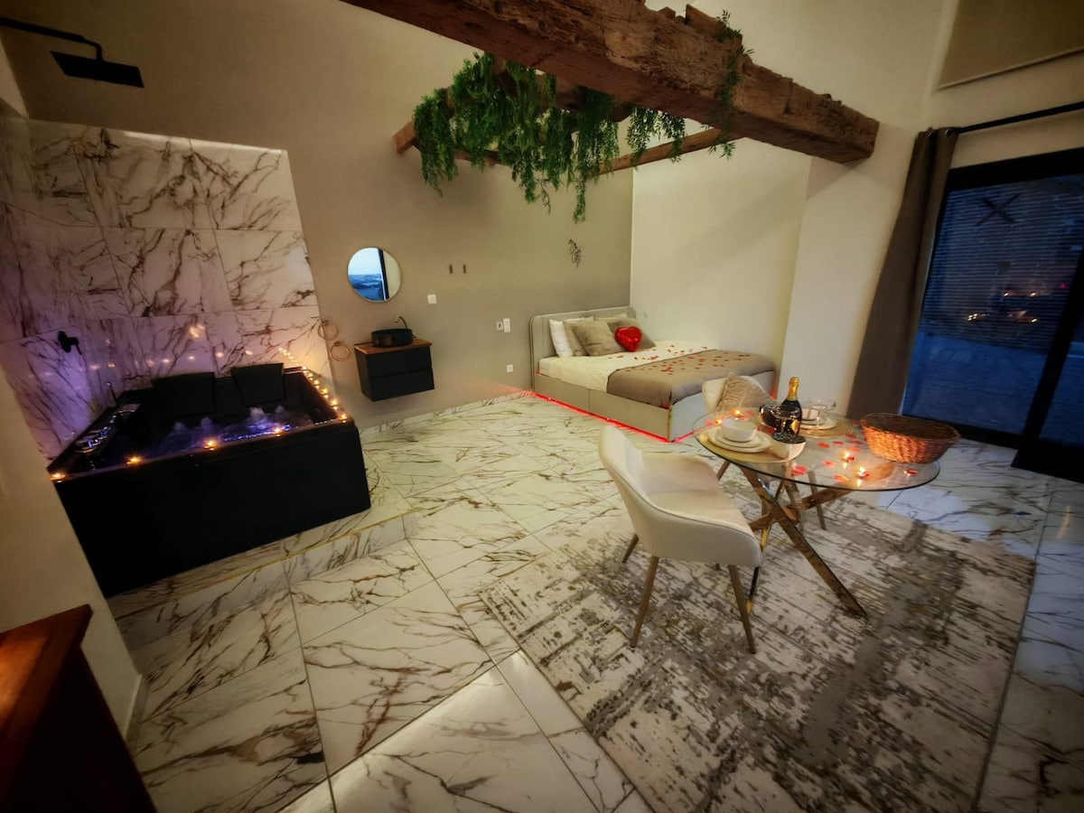 Un nidito bohemio y elegante, de 4 estrellas, una escapada en pareja en una isla paradisíaca. ¡Ven y déjate mecer por las cálidas olas de una isla lejana! 2 personas máximo Desayuno incluido Opcional: aperitivos, pétalos de rosa, velas, champán Ropa de cama de muy alta gama Jacuzzi: 2,13 m x 1,93 m Juegos/Regulador de luces (dormitorio, sala de estar, Spa) Lienzo/foto retroiluminado Altavoz Bluetooth en el techo TV de pared/orientable Terraza amueblada 1 parking