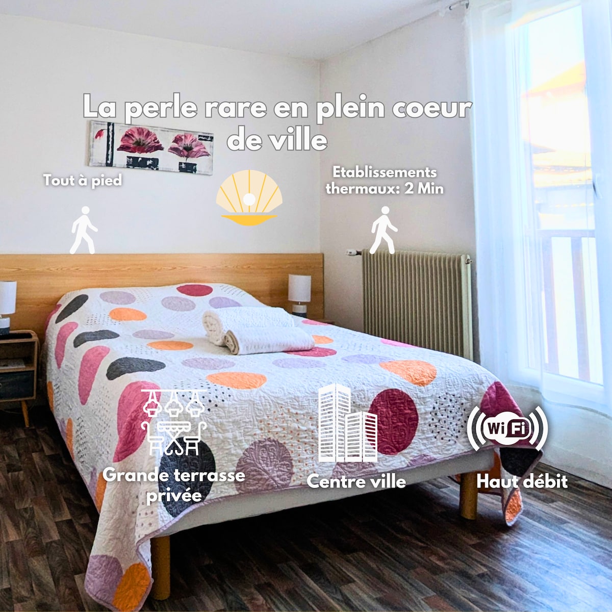 studio idéalement situé à 2 pas des commerces et des thermes. dans une résidence calme, parking gratuit, wifi, TV, lave linge, cuisine américaine, vaisselle... A une heure de la plage et de la montagne Attention, nous laissons la possibilité de réserver pour une seule nuitée mais dans ce cas les draps et les serviettes ne seront pas fournis.