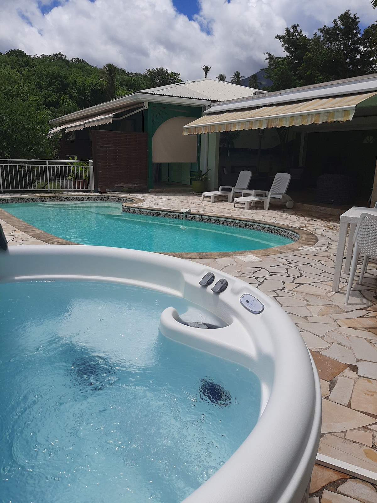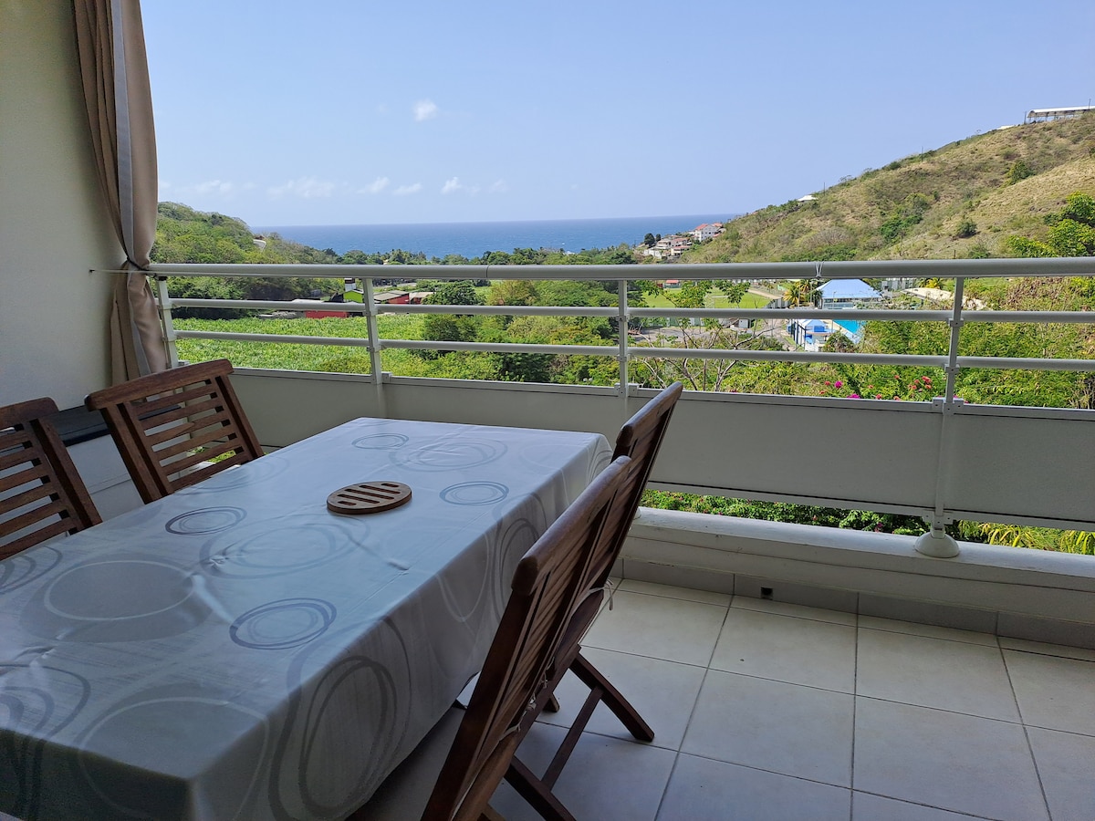HermosoT2 bien diseñado y bien equipado que incluye una habitación con aire acondicionado. Sala de estar, cocina abierta que incluye: lavavajillas, horno,microondas, mini horno, placa de inducción, lavadora. Todas las habitaciones más una terraza cubierta con zona de comedor+salón exterior dominan el mar Caribe Información Senderismo Montaña Pelée(INSCRITA A UNESCO) , buceo,parques botánicos,ciudad histórica de Saint-Pierre,rhumeries,centro de estudios de volcanes. Cerca, playas, tiendas, restaurantes