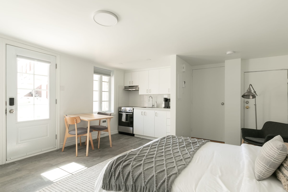 Au cœur du quartier patrimonial avec vue sur le fleuve de la rue ! À deux pas du fleuve, restaurants, évènements et l'amphithéâtre. Face au parc de la place d’Armes, sur toute petite rue calme et très charmante du vieux Trois-Rivières. Mini studio style chambre d’hôtel avec petite cuisinette, salle de bain et douche italienne entièrement rénovées ! Meuble télé se convertit en mini table à manger pour 2 collés. Espace style Tiny House. Stationnement inclus sur lot à 240m tout près. CITQ 301550