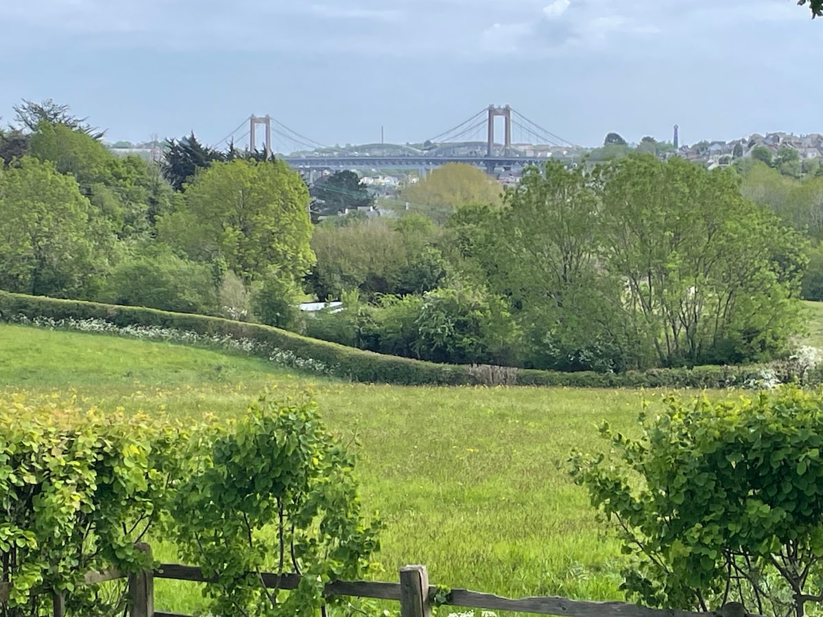 ¡De la marisma al mar! La propiedad se encuentra en el valle del Tamar, en la frontera entre Devon y Cornualles. Se encuentra con impresionantes vistas al mundialmente famoso Royal Albert Bridge (1859) de Brunel y al Tamar Bridge (1961). A 5 minutos se encuentra el China Fleet Golf and Country Club. El uso privado del campo que se muestra está incluido en el alquiler y es ideal para un pícnic. Nada mejor que una copa de vino fuera junto al fuego por la noche disfrutando de las vistas de los puentes. Un Cornish Cream Tea te da la bienvenida a tu llegada.