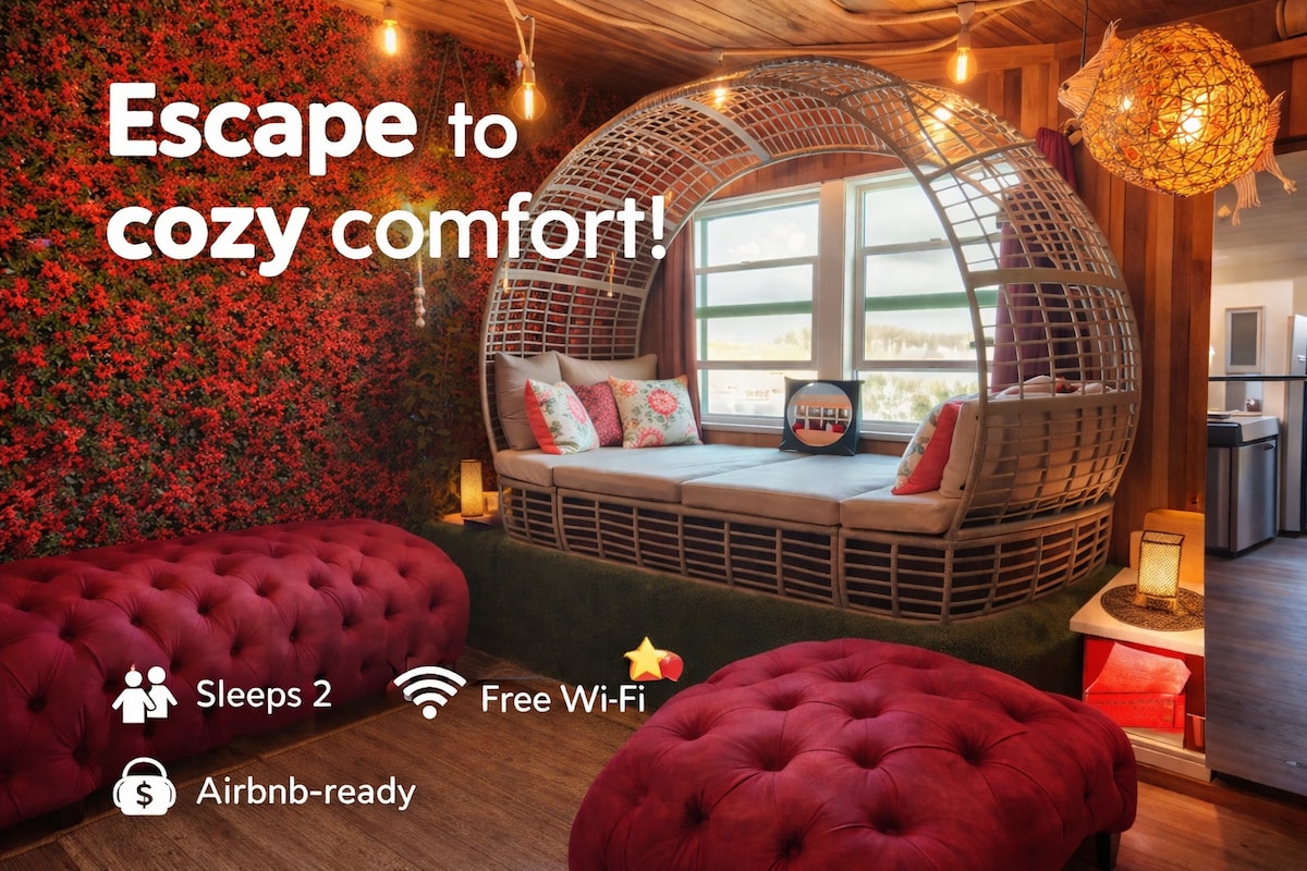 You've found an exquisite small, comfortable cabin filled with all the love that a home can contain! It's located in a garden paradise! ...a yard where you are encouraged to step off the path to pick fruits and vegetables. It's a lover's hideaway with multiple places to enjoy private conversation, champagne or simply be. Play scrabble in the vegetable garden, drink wine in the flower garden. African tortoises roam the yard on warm days, Rhode Island Reds hunt for bugs and provide fresh eggs.