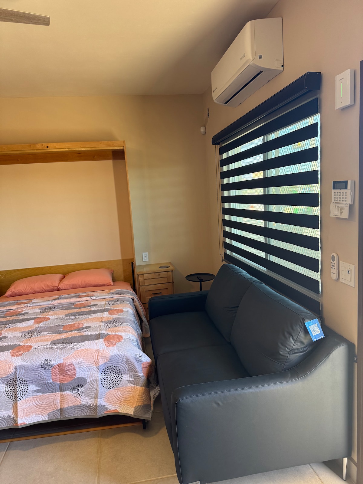 Calis Baja Condo #2 is a one bedroom condo, that comfortably sleeps 4. Equipped kitchen (full size refrigerator & 4 electric burner stove) Living room area has an L shaped couch that converts into 2 single beds for additional sleeping. Perfect place for small families, couples, solo adventurers or business travellers. Unit is 1 of 3 in gated property. Amenities include Pool,2 BBQs (charcoal & propane) 3patios (Rooftop Palapa 360° views of the Sea of Cortez, Wifi and A/C.Just minutes to downtown