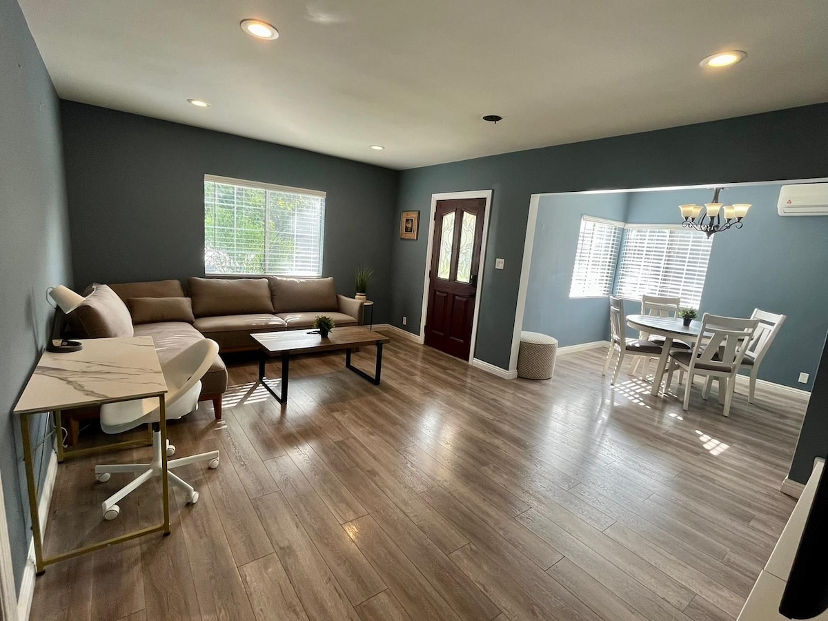 Este es un estudio totalmente renovado ubicado en la tranquila cima de una colina. Está en un barrio tranquilo y seguro. Esta es una casa trasera y el anfitrión vive en la casa delantera. Hay muchos restaurantes y supermercados a 5-10 minutos en coche. La mayoría de los electrodomésticos son nuevos. Nueva Smart TV 4K de 55 pulgadas y aire acondicionado central en toda la casa. La casa está cerrada con estacionamiento gratuito en la calle. La lavadora y la secadora son de uso gratuito. Está a unas 14 millas del centro de Los Ángeles, a 22 millas de Universal Studio y a 26 millas del centro vacacional Disneyland.