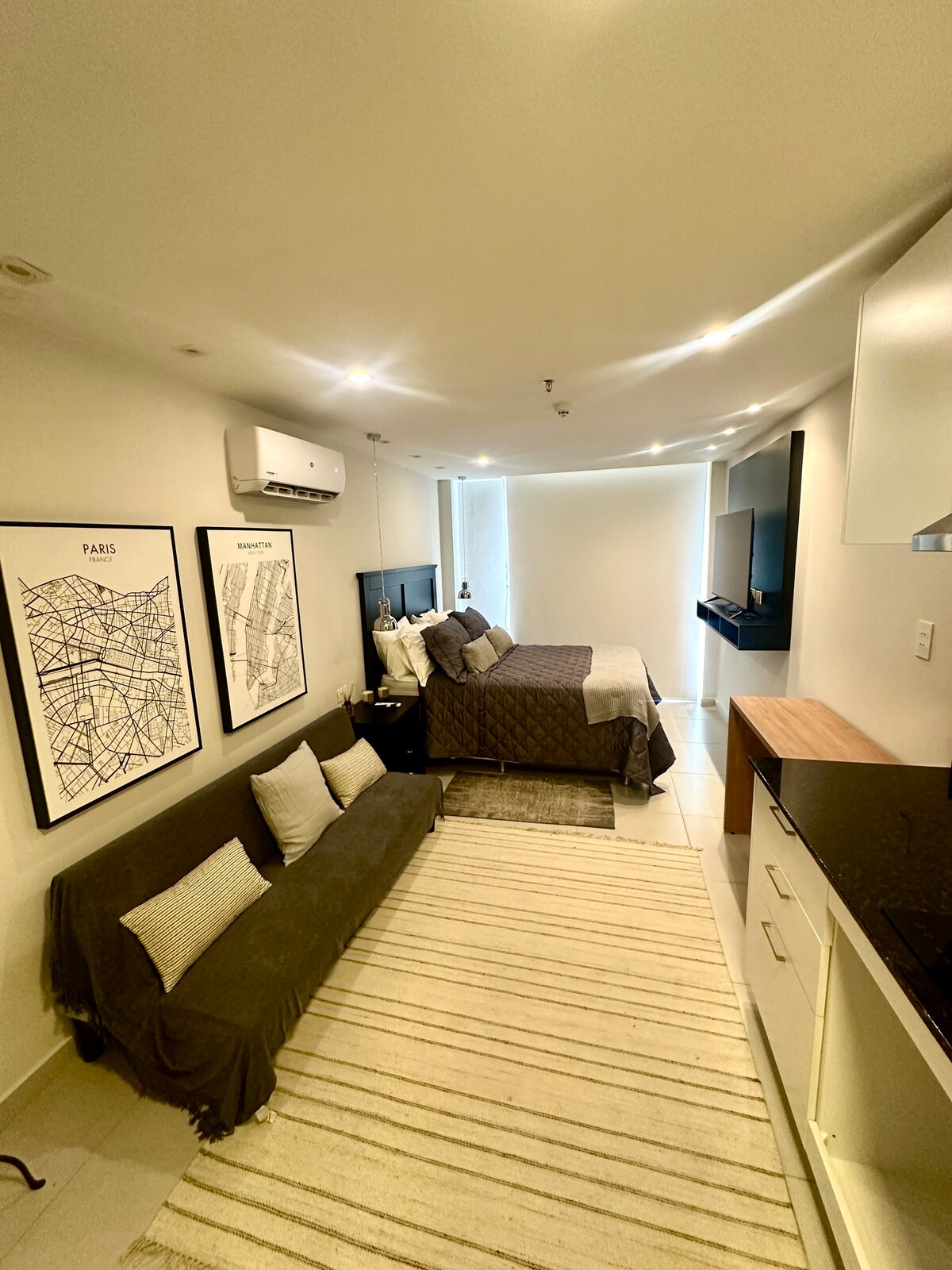 Moderno Estudio en Ycua Satí.Recientemente estrenado Completamente equipado, ideal para viajeros solos , parejas o familias pequeñas. Espacio cuidadosamente diseñado , a solo 5 minutos del Paseo La Galería. Nuestro estudio cuenta con : Cama queen-size con sábanas frescas y almohadas mullidas Un pequeño sofá Cama Cocina Equipada: con anafe , horno , extractor , microondas, heladera , cafetera , utensilios básicos de cocina y vajilla completa . Balcón Privado Wi-Fi Te esperamos !!!!!