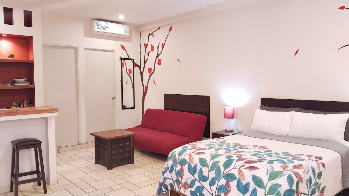 ✨ Amplio departamento en planta alta (22 m2) en un hermoso jardín tropical con más de 40 árboles frutales. Ubicado en el corazón del centro de Cabo! Tiendas, restaurantes y vida nocturna a unos pasos! 5 min. a pie de la marina y 15 min. a pie de la playa 🏝️ ✅ Colchón memory foam y cortinas opacas para descanso ✅ Estacionamiento privado GRATUITO ✅ Baño privado con amenities ✅ Cocina privada con electrodomésticos ✅ Café y té de cortesía ✅ TV con Netflix y YouTube ✅ Caja fuerte en la habitación