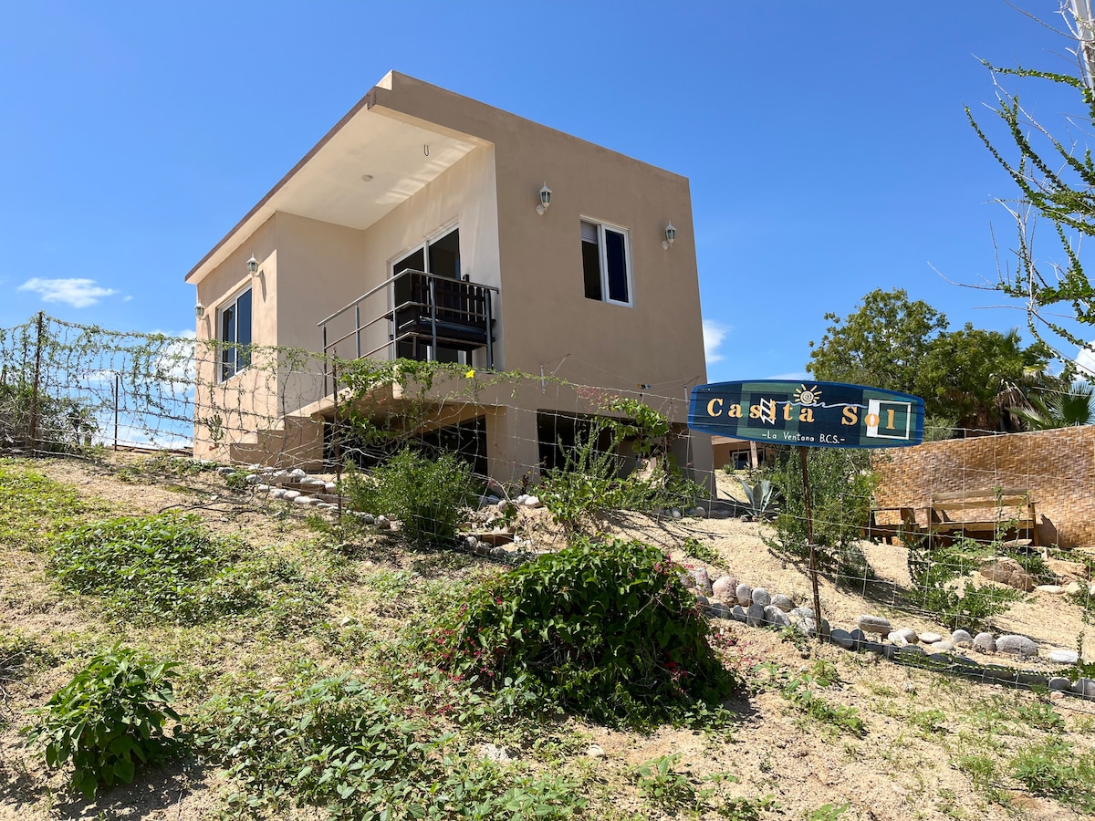 Disfruta de la sencillez de este alojamiento tranquilo y céntrico. Este alojamiento es especial porque fue diseñado pensando en los amantes del mar, el viento y la tranquilidad, toda la propiedad para ti. A solo 5 minutos caminando de la playa y Playa Central, esta casa nueva combina comodidad moderna, conexión confiable con Wi-Fi satelital Starlink, y un ambiente relajado con vistas espectaculares a la bahía y el desierto, bodegas para guardar tu equipo deportivo y kite.