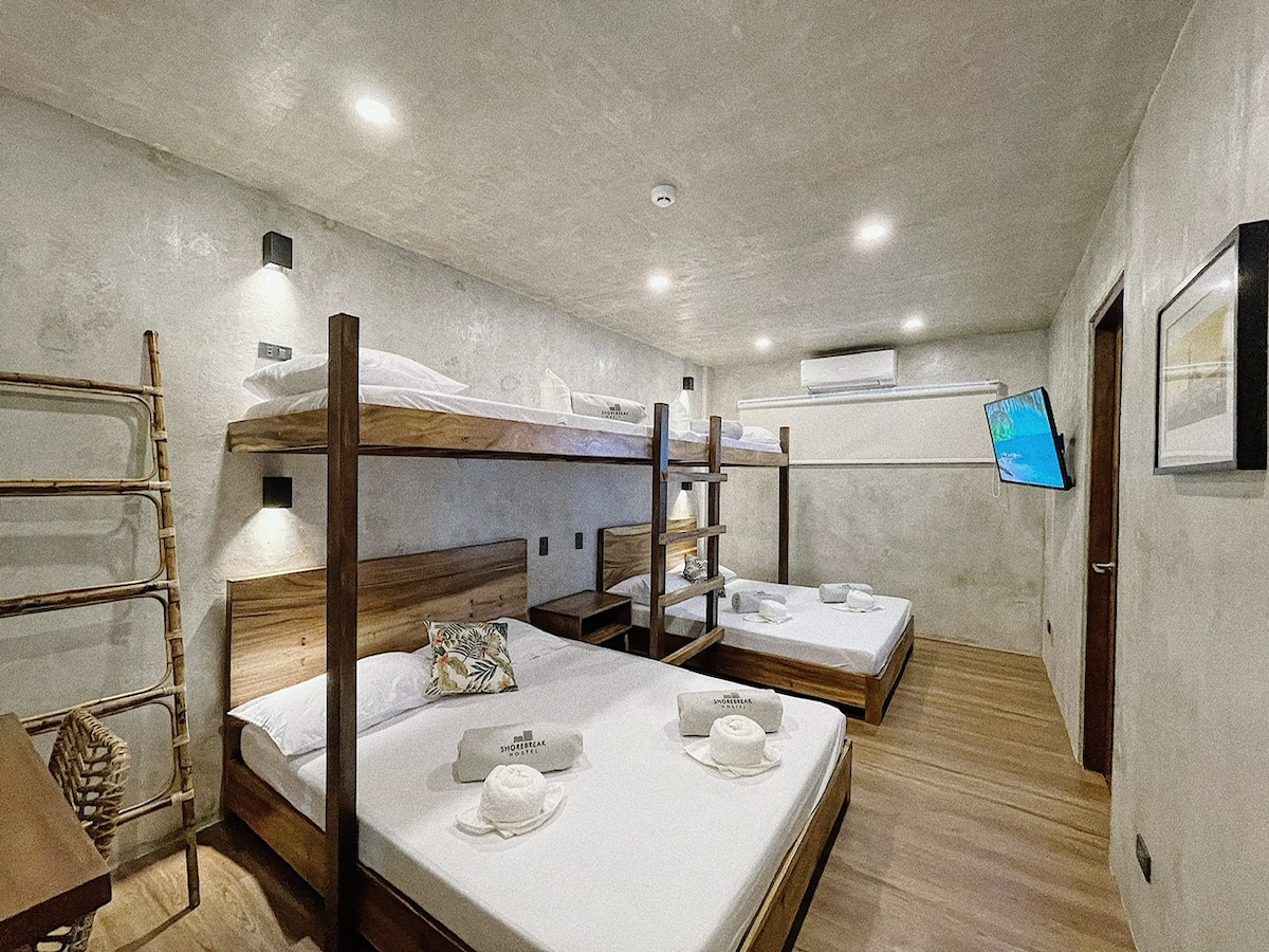 Perfecta para familias o grupos, nuestra habitación familiar ofrece espacio, comodidad y un diseño único con capacidad para 6 personas. Diseñada cuidadosamente con una litera hecha a medida, la habitación incluye dos camas tamaño queen y dos camas individuales, ideales tanto para adultos como para niños. Esta habitación tiene persianas enrollables, lámparas de noche, un escritorio con lámpara y una escalera para toallas. Viene con sábanas frescas, mantas, toallas esponjosas y un baño privado con ducha fría y caliente, bidé, agua filtrada y artículos de tocador de cortesía.